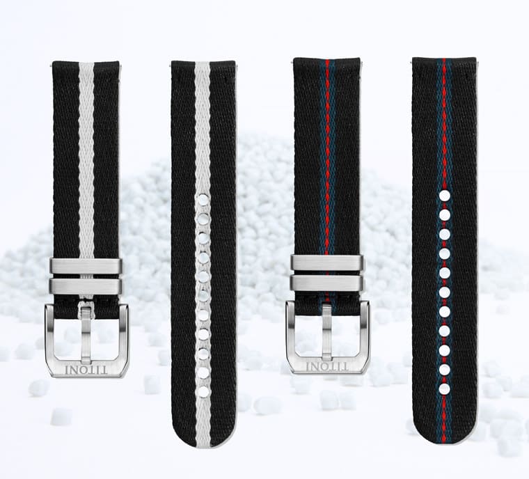▲TITONI x Tide Ocean織紋錶帶目前共有黑/白款與黑/藍/紅款等選擇。每條錶帶參考價:NT$ 2,800