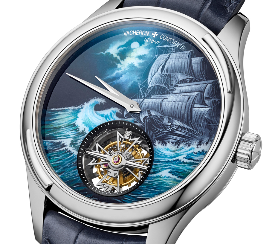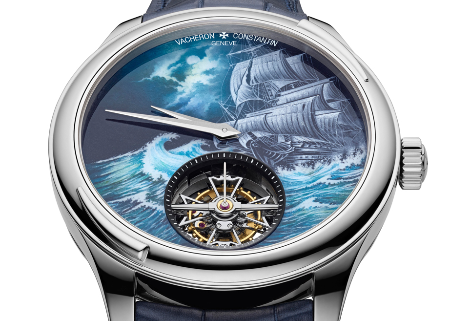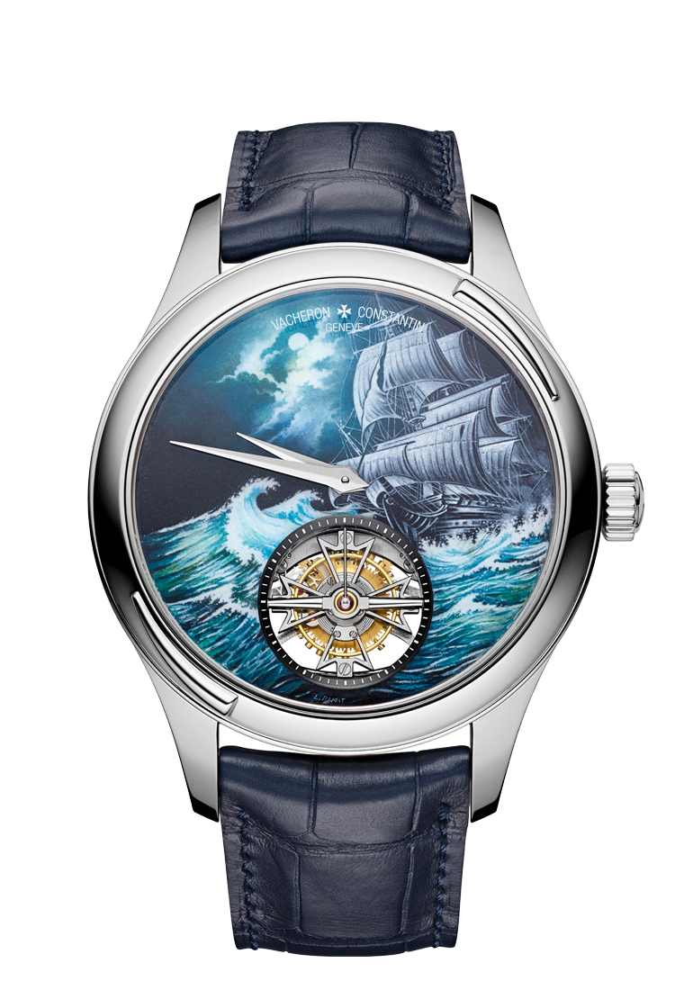 2022年——這枚獨一無二的Les Cabinotiers閣樓工匠三問報時陀飛輪Flying Dutchman 腕錶以傳說中的幽靈船「Flying Dutchman (飛翔的荷蘭人)」為靈感而打造。錶盤 上以微繪琺瑯和灰階琺瑯工藝,生動呈現出這艘傳奇之船迎著閃電與風暴劈浪駛來的畫面。腕錶 搭載由江詩丹頓自行研發並製造的2755 TMR機芯,配備一分鐘陀飛輪和三問報時裝置。