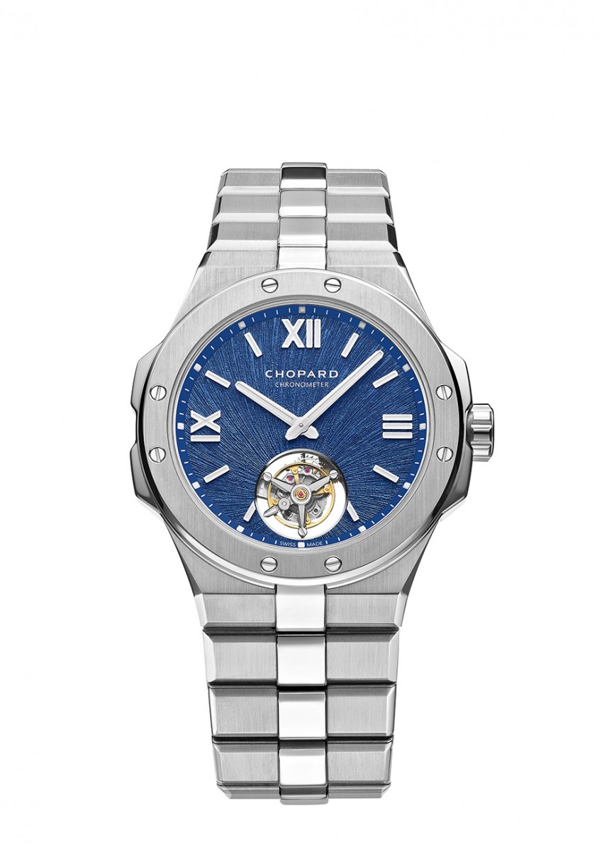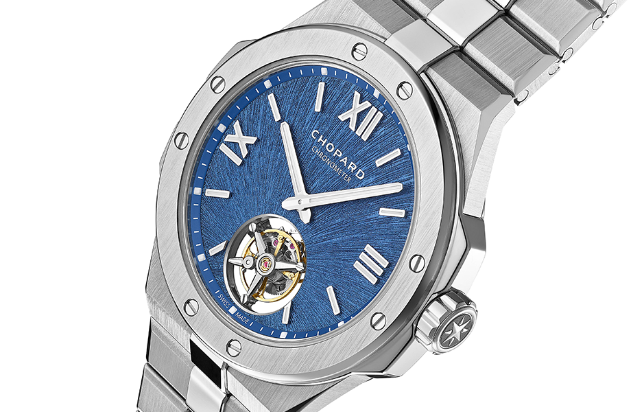 CHOPARD蕭邦運動錶款Alpine Eagle系列時計,繼飛返計時機芯和高振頻機芯之後,2022年又在複雜功能機芯中新添一款飛行陀飛輪款式「Alpine Eagle Flying Tourbillon腕錶」。此錶搭載L.U.C 96.24-L型機芯,同時榮獲瑞士官方天文台精密時計認證和「日內瓦印記」,在同類別飛行陀飛輪腕錶中實屬罕見,是第一款搭載此複雜功能的非限量版錶款。採用41毫米直徑錶殼,配備一體化整合錶鍊,完全在蕭邦工坊中自行製作而成。錶殼所採用的Lucent Steel A223精鋼為品牌獨家專有合金,堅固耐磨,閃耀亮澤,引人注目。富有質感的阿萊奇藍色(Aletsch Blue)錶盤在6時位置設鏤空視窗,令輕巧通透的陀飛輪裝置一覽無遺,為整枚腕錶賦予優雅時尚風範。