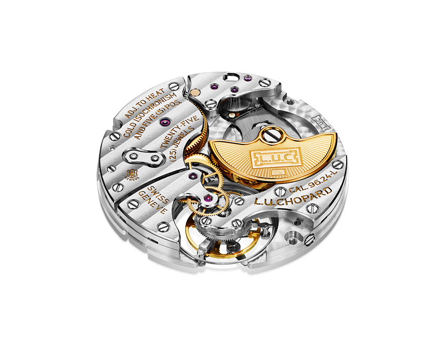 腕錶的飛行陀飛輪不設上層錶橋,陀飛輪框架僅由下層錶橋固定,透過機芯產生透明的視覺效果,彷彿懸浮於半空中。L.U.C 96.24-L型機芯以蕭邦錶廠開發的第一款機芯——1997年推出的L.U.C 96.01-L型機芯為藍本,厚度亦與前代機芯不相上下,僅為3.30毫米。