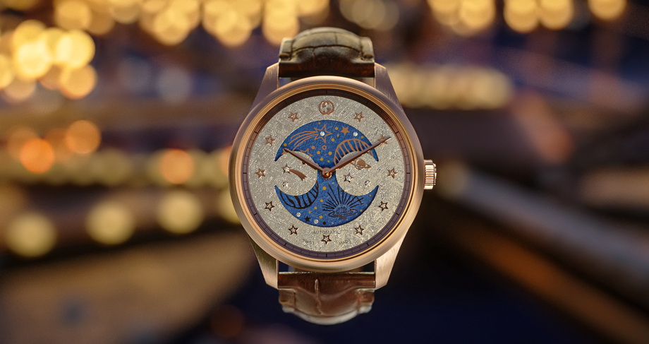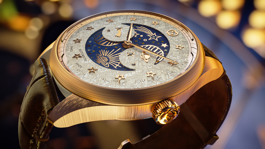 MOONLIGHT 錶面上精心裝飾的月亮從閃閃發光的銀色新月逐漸變成散發珍珠光彩的圓盤。G-TIMELESS MOONLIGHT以全新的Gucci機芯GGV838.MP為核心打造,絕對的精密技術使其能夠根據29.5天的月相週期正確顯示時間。這款時計展現精巧絕倫的高級製錶工藝,每360年只需調整一次。提供玫瑰金和白金款式,天然隕石錶面上可見行星不停旋轉,恆星鑽石熠熠生輝。