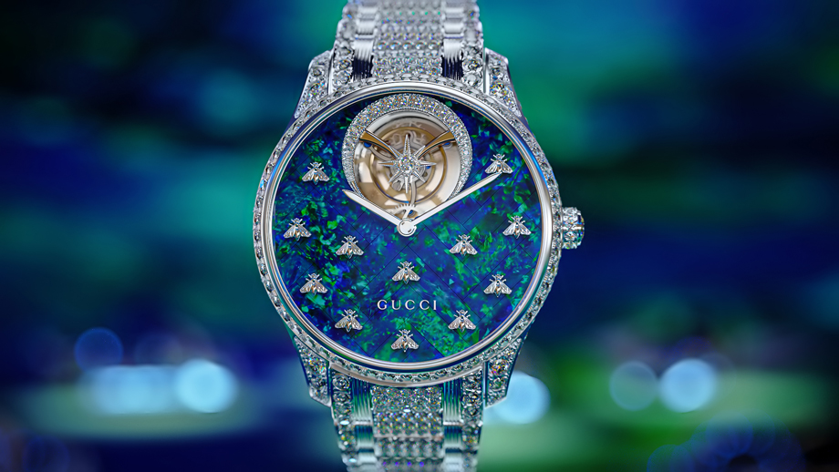 2022年,Gucci推出鑲嵌鑽石新作,為G-TIMELESS DANCING BEES陀飛輪腕錶系列增添生力軍。歷史悠久的「En-tremblant」珠寶風格是指經過精心設計,能夠跟著佩戴者的節奏晃動的首飾,而全新錶款便以隨著手腕擺動而在鑲鑽錶面上閃耀光芒的12隻蜜蜂,向此經典設計致敬。經過一再的試驗,大師級工匠提升了粉紅色和綠色兩種稀有蛋白石品種的自然光澤,形成長方形「磚塊」,進而在珍珠母貝錶面上創造出小巧的山形圖案。蛋白石的自然紋理使每個錶面設計變得獨一無二,鏡面錶背則可鐫刻個人資料。所有G-TIMELESS DANCING BEES鑲鑽腕錶均提供搭配白金和黃金鍊帶或鱷魚皮錶帶的款式選擇。
