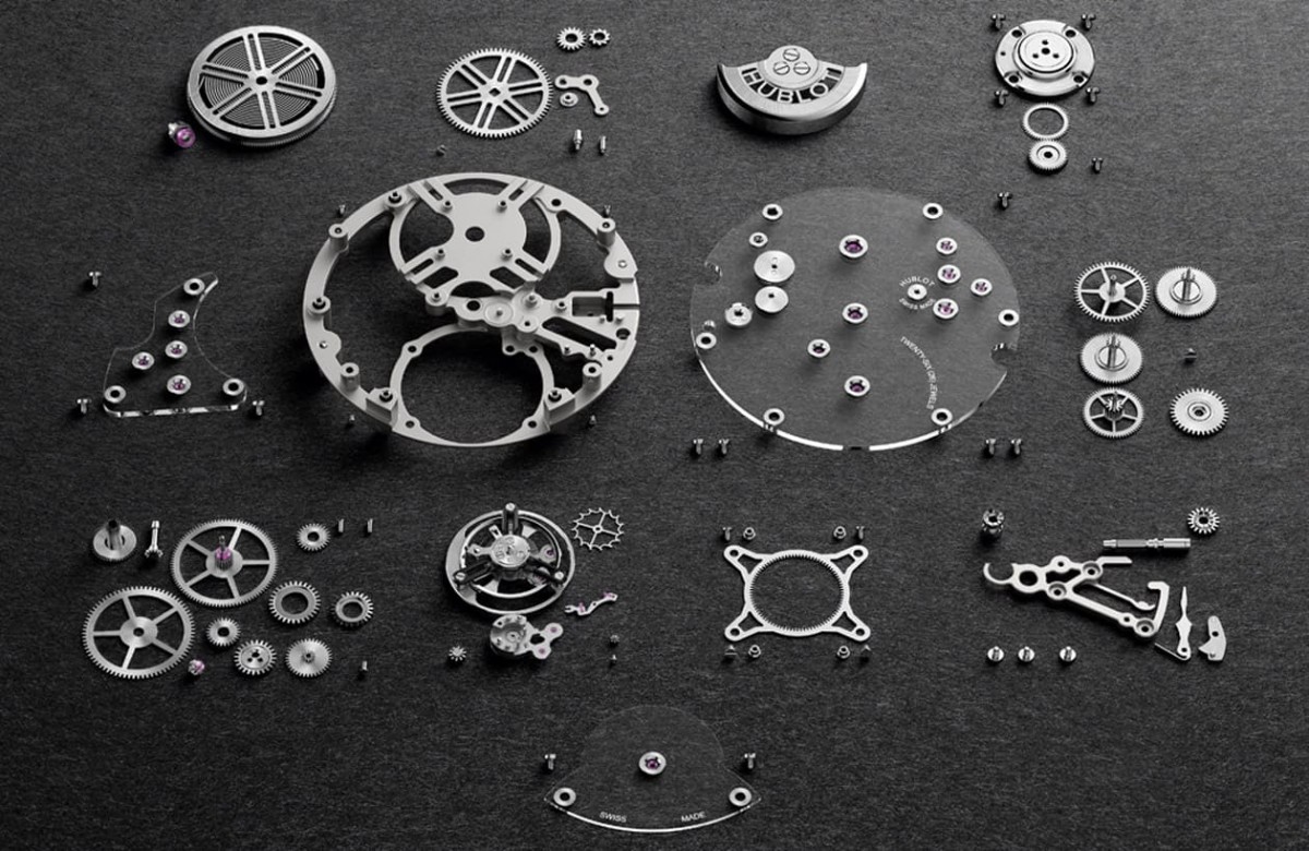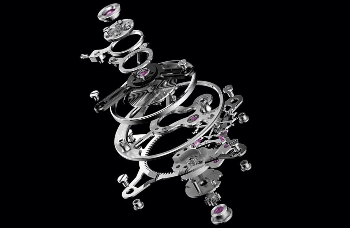 HUB6035機芯的零件數達到243枚之多,比起一般陀飛輪機芯更複雜,關鍵在於品牌為了呈現通透視野所做出的創新設計,大致而言這枚機芯具有以下三項特徵: