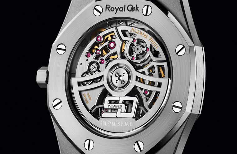 不只結構有重大調整,2968機芯連外觀的打磨修飾也都有自己的個性,除了自動盤採用RO 50週年的特殊樣式這個不需多講以外,AP更以Traits tirés紋飾取代日內瓦波紋,另外鍍銠鏤空底板望進去還能看到深一層的機芯構造,如金黃色的齒輪零件便能盡收眼底。