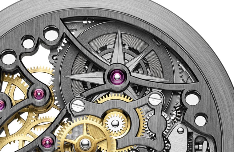 江詩丹頓奠基於2160機芯催生的2160 SQ機芯不只是表面上看起來把機芯零件鏤穿如此簡單,因為在鏤空零件的同時還要兼顧機芯結構的穩定性,讓機芯在重量降低(2160 SQ機芯重量比2160機芯輕20%)之餘,其還是能夠穩健地運轉。為了強化機芯的視覺效果,品牌特別將多數機芯零件表面以NAC電鍍鍍上一層煤灰色,至於零件邊緣的倒角與拋光絲毫不受影響,另外零件本身也都經過不同形式的打磨修飾,包括22K金環型自動盤上也有立體雕紋與粒紋處理等。