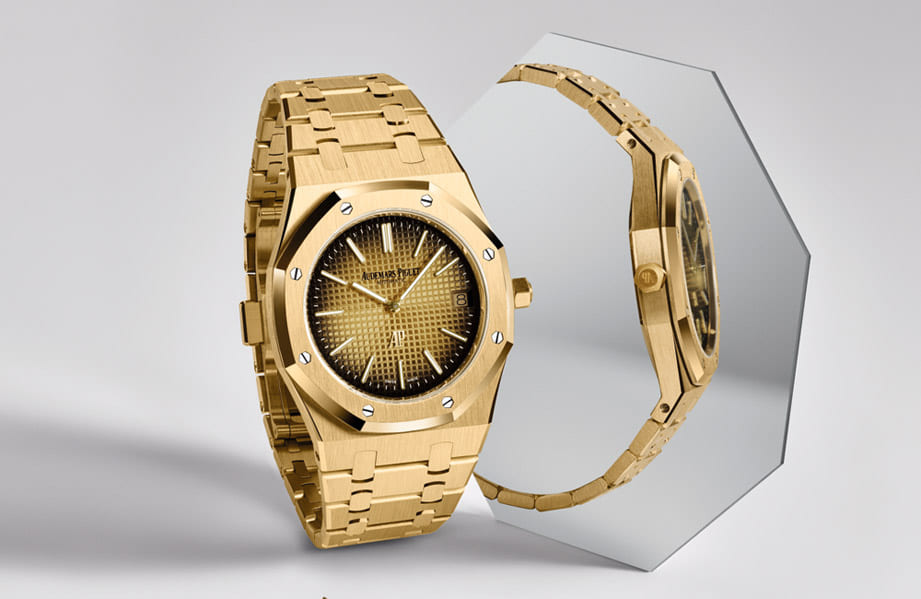 ▲皇家橡樹16202BA採用黃金錶殼搭配電鍍金色面盤,面盤邊緣呈現煙燻效果,具備獨特個性,目前市場行情遠高於NT$ 2,064,000的定價。