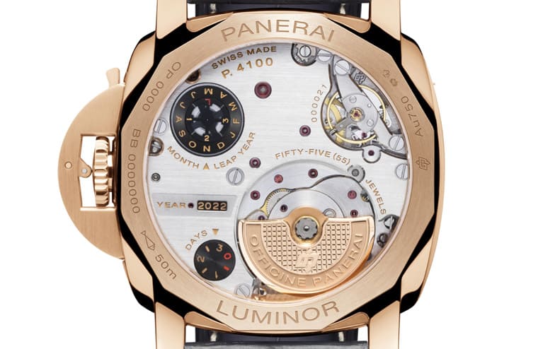 錶背透明底蓋下露出P.4100機芯組件,在此可以看到機芯的微型自動盤、擒縱系統、月份顯示、閏年顯示、年份顯示以及動力儲存顯示等資訊,巧妙地將萬年曆手錶繁複的資訊量平均分配到手錶的正反面空間中,讓人讀時時可以從容不迫,也能在需要時獲取完整的日曆資訊。而這枚機芯還有個特點在於調校時間一律藉由錶冠進行雙向處理,沒有另外設置其他按把,盡量簡化佩戴者的操作方式,讓手錶使用起來更直覺。