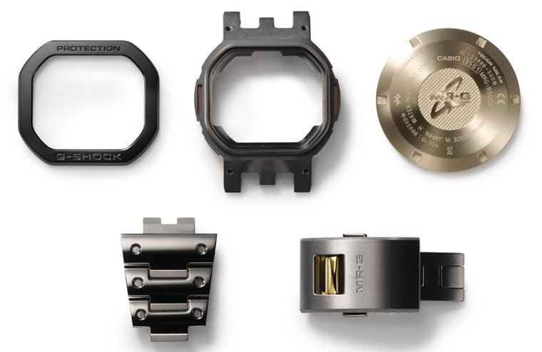MRG-B5000將原本一體成型的錶圈設計,改由25枚不同零件重新組合而成,並對每枚零件進行拋光處理,此外為了還原DW-5000C的鍊帶特色,品牌還在每個金屬鍊節的圓孔中嵌入獨立針腳,以便對錶帶進行更細緻的拋光處理。MRG-B5000透過多重零件組合出全新耐衝擊構造,在手錶的2、4、8、10點鐘方向的T形零件內,加入彈簧墊片吸收衝擊,確保手錶的抗震性依舊出色甚至更上層樓。