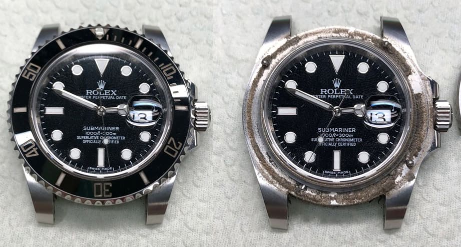至於錶圈下卡著這一層污垢會有什麼影響,鐘錶師傅表示勞力士對於錶殼材質用料講究,因此有一層污垢在那也不容易造成零件生鏽,不過長期累積下來對手錶肯定不好,例如可能錶圈旋轉時會沒那麼順暢之類的,而就算這種影響不是很嚴重,維修師傅也還是建議錶主定期就要把錶送去保養清潔,因為別的不說,光是出於衛生考量,避免一些細菌、髒污殘留在手錶上,這樣的目的就已經很足夠。