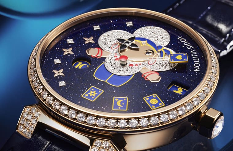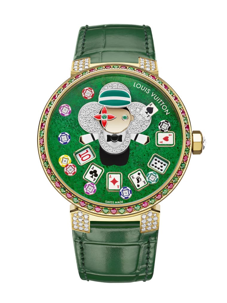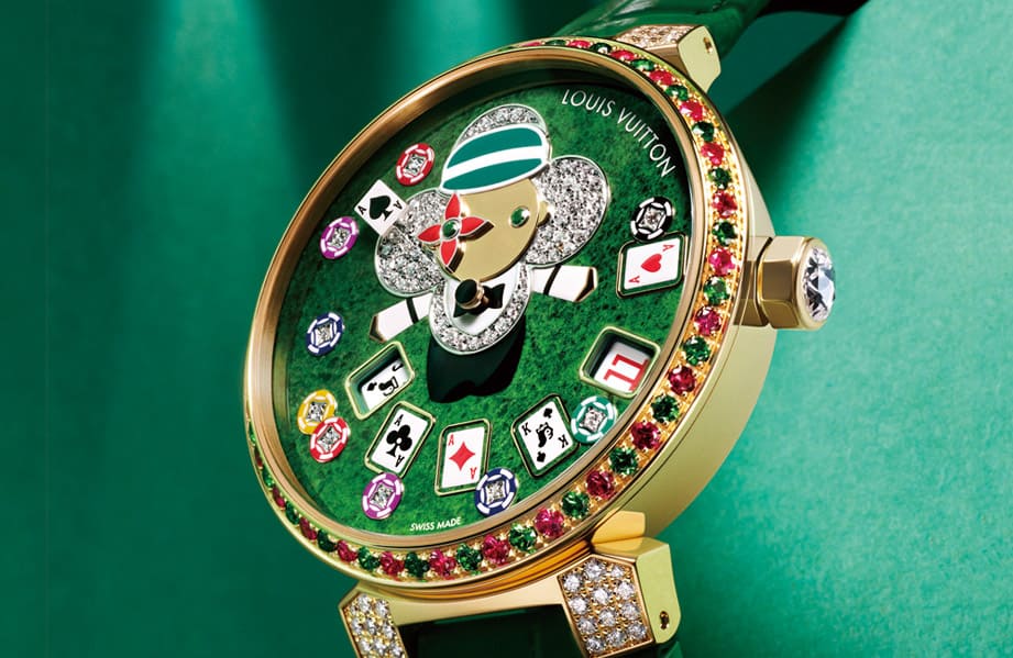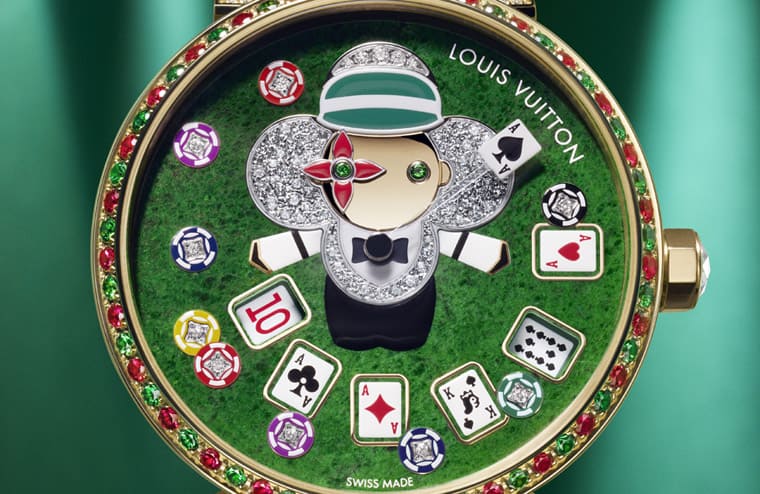 三款Tambour Slim Vivienne雖是用不同錶殼材質以及不同主題的Vivienne人偶圖像構成,但是它們搭載的機芯是同一枚,因此手錶的奇特顯時方式其實是一致的。補充一提,三款手錶面盤上的塔羅牌、撲克牌、Monogram老花和小時數字都是由路易威登的工藝師精心手繪完成,這讓面盤圖案看起來相當精緻可人,與俏皮的Vivienne圖像搭配相得益彰。