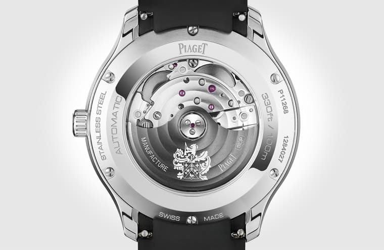 錶背一樣露出1110P機芯,這枚機芯屬於800P機芯的後繼機種,1110P機芯的厚度4mm在伯爵旗下不算特別突出,但相對來說運動錶也不適合過於薄型化的機芯,而機芯的規格重點包括4Hz震頻、50小時動力儲存等也都堪稱中規中矩,再者三針加上日期的功能性,以及100米防水性能等皆足以應付生活中多數場合所需。