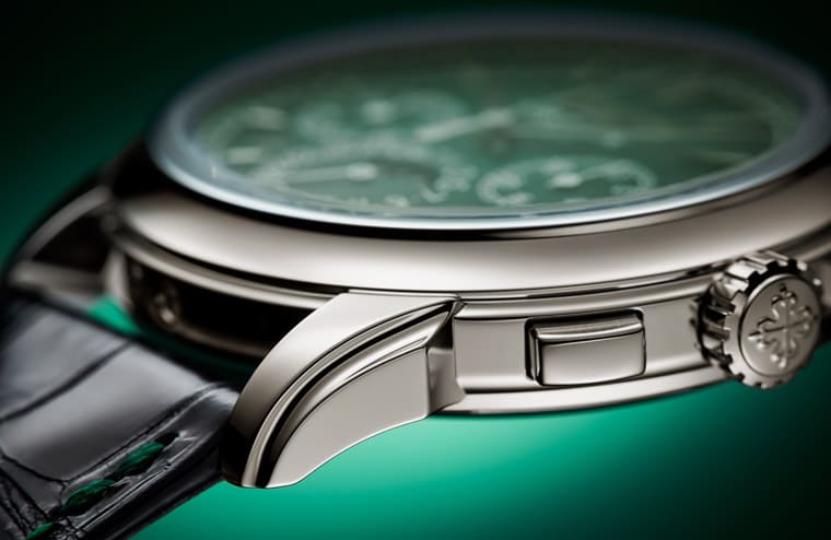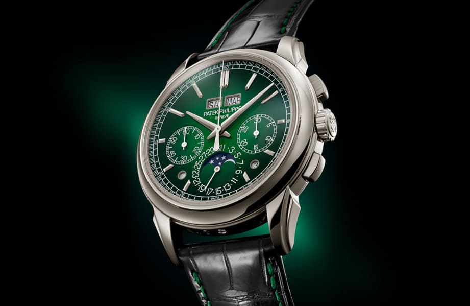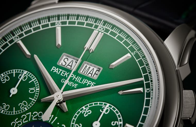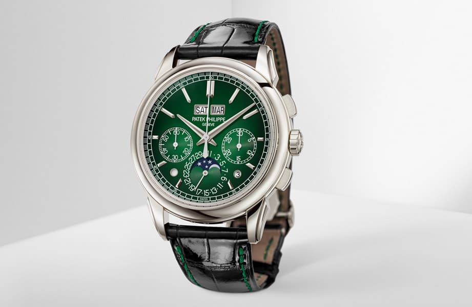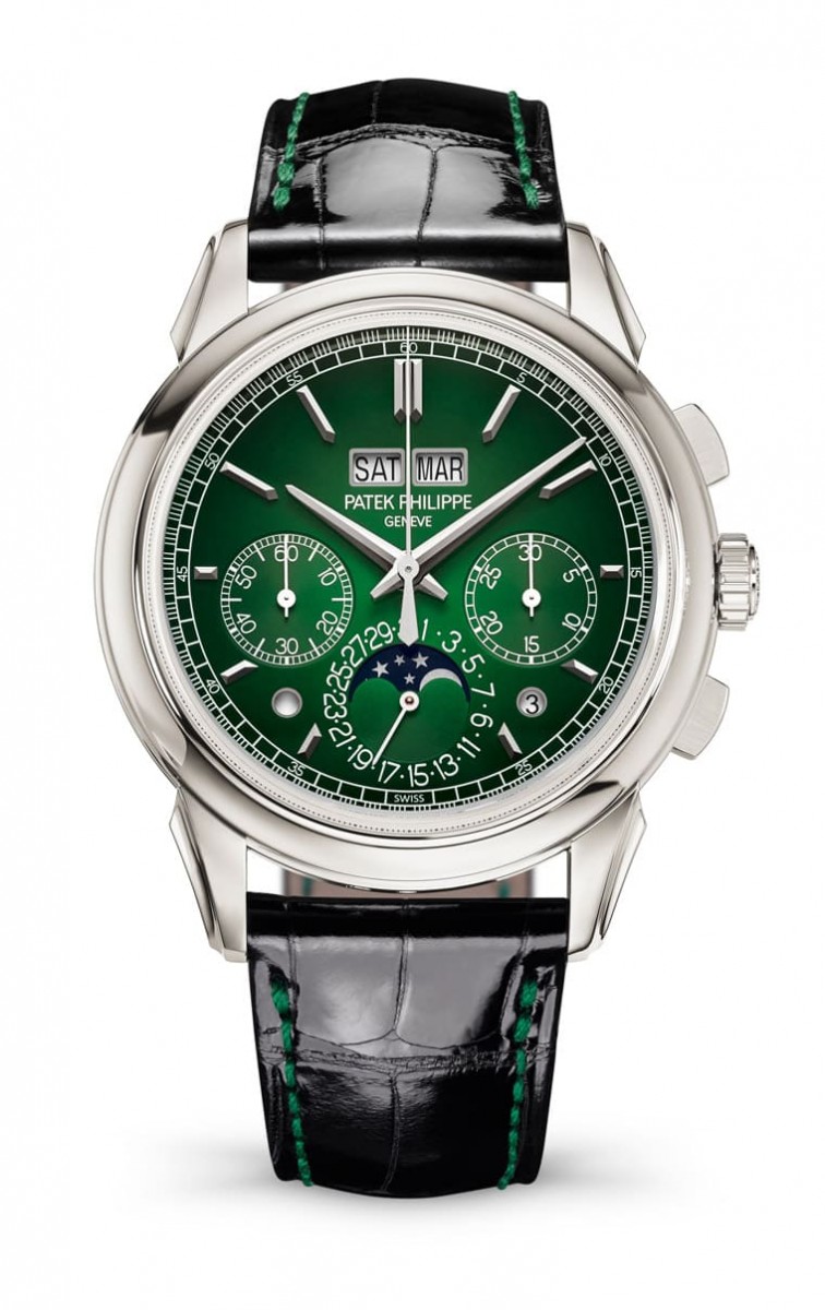 ▲百達翡麗5270P萬年曆計時碼錶2022年推出新改款,主要變化在於面盤顏色從乳白金色換成綠色漸層。