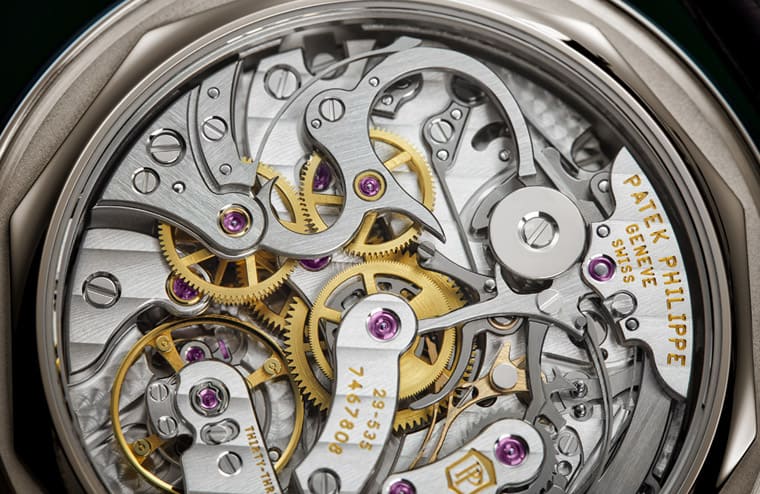 ▲結構複雜的CH 29-535 PS Q機芯在錶背一覽無遺,百達翡麗講究的工藝水準從零件的細膩度可見一斑。