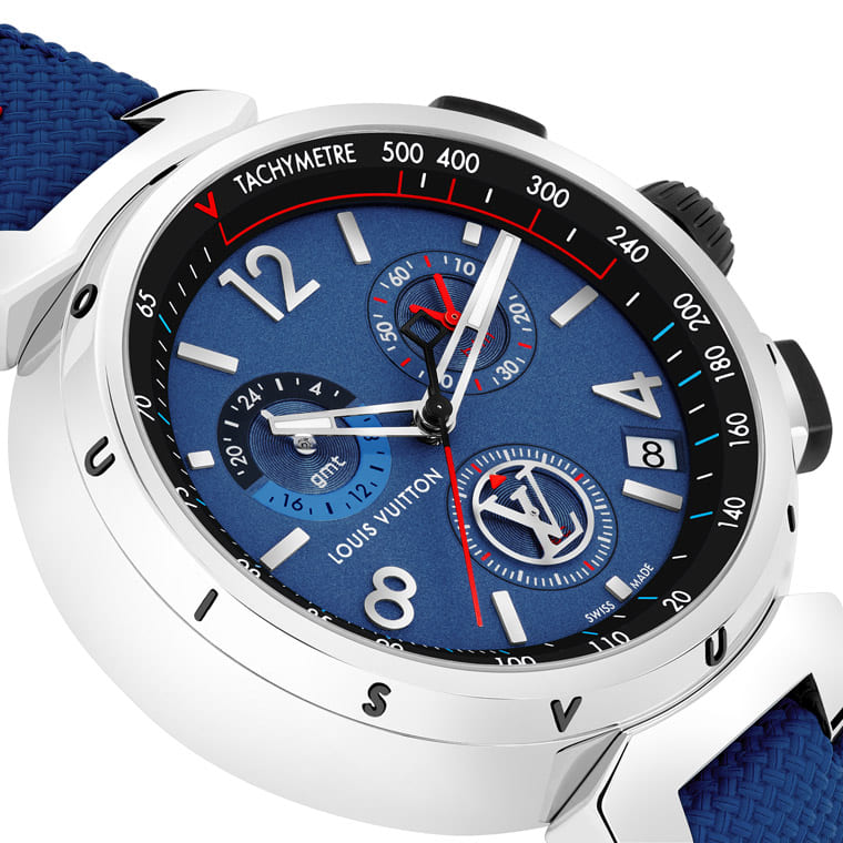 手錶面盤顯示的功能繁多,首先你可能會先注意到6點方向有一枚LV的經典Logo,那是品牌用來裝飾小秒顯示的創意,再來4~5點方向間則有日期顯示,而2點方向則有計時小錶盤,另外在10點方向又有24小時制的兩地時間顯示,且面盤外圍還設有測速計刻度,搭配中央計時大秒針,其針尖部分特別塗上紅色,因此判別時間相當輕鬆。