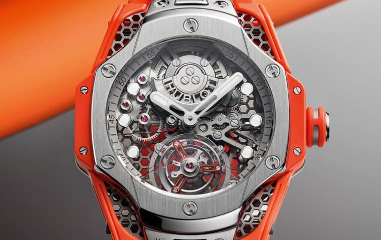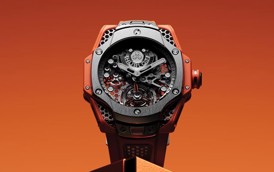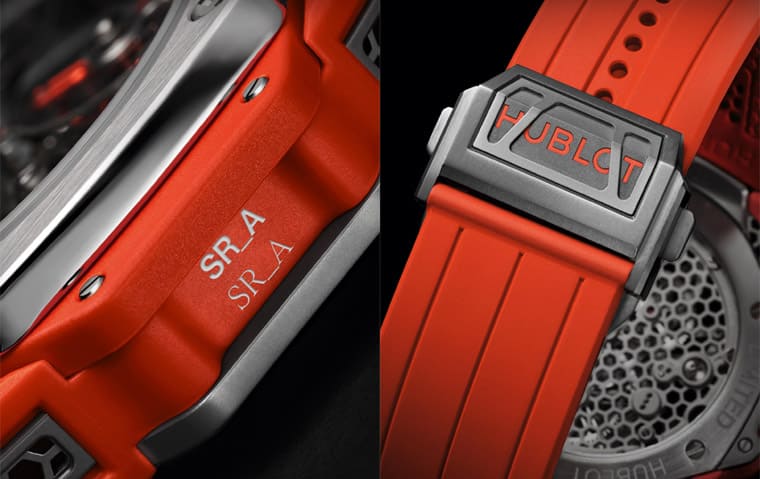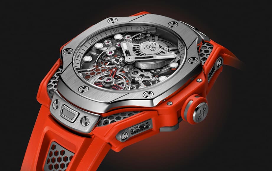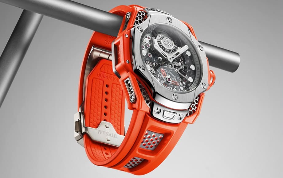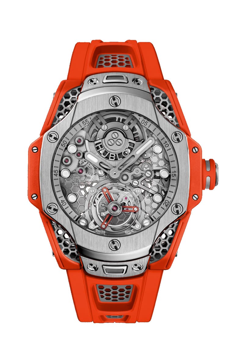 ▲鈦金屬材質經過鏤空與不同形式的拋光打磨,形成繁複層次,同時宇舶再用橘色橡膠材質包覆手錶局部外觀,形成別具一格的造型。