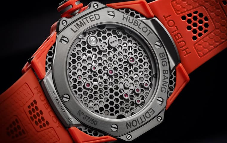 ▲錶背同樣以蜂窩狀底板覆蓋,使得HUB6035機芯猶如蒙上一藏面紗,雖然讓機芯結構不易看清楚,可也因此平添一股有別於一般手錶的工業風。