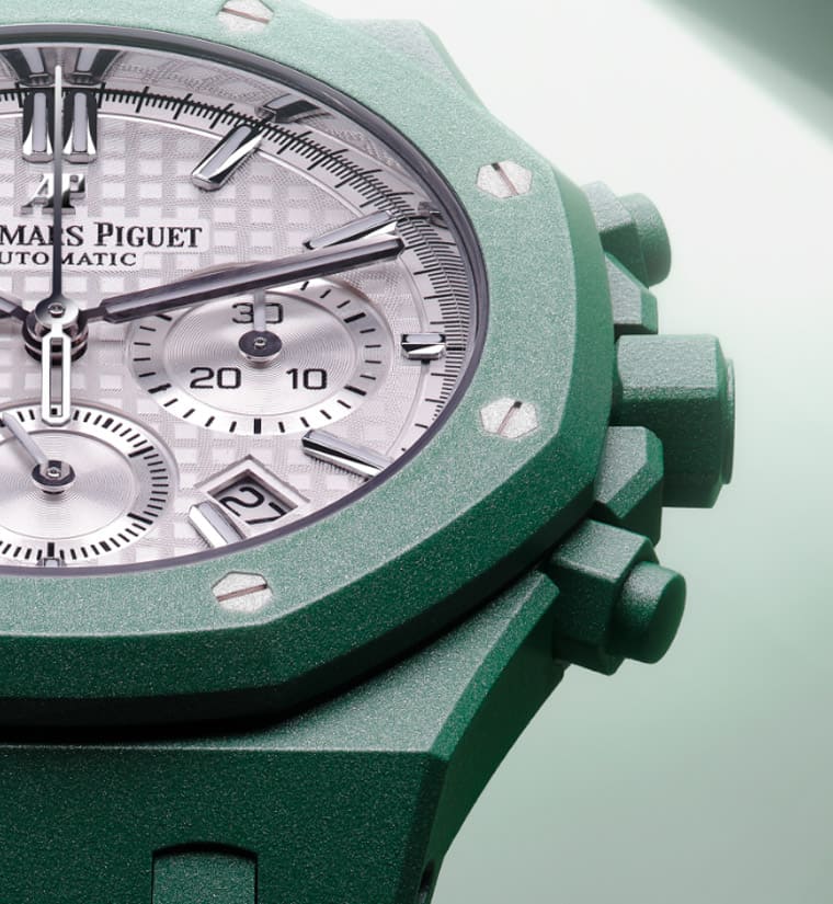 看起來獨樹一幟的綠陶瓷殼皇家橡樹計時碼錶26315ST,品牌官網提供的資訊其實很有限,包括設計靈感、陶瓷加工方式、限量數和價格等都不詳,可是光看手錶外觀就可以多少感受到它的得來不易,光是要研發彩色陶瓷抓到對的比例與關鍵技術就已經不容易了,且後續還要把高硬度的陶瓷切割加工成手錶外觀幾乎所有的零件(只差錶圈固定螺絲和錶背底蓋零件不是陶瓷)也很有挑戰性,能改裝出這種特殊樣式的陶瓷作品可以證明MAD Paris的功力不俗,但話說回來要完成這項改錶任務,費用想必也不可能有多親切就是了。