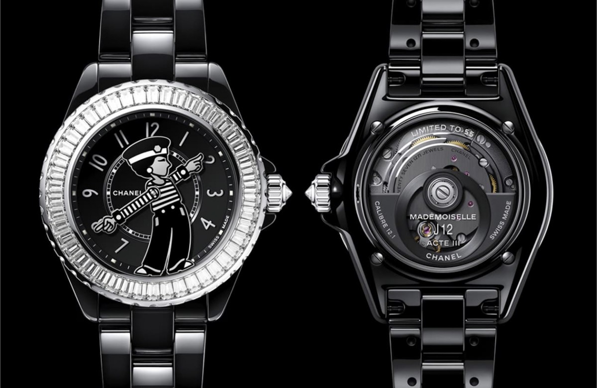 而風格相對活潑的Mademoiselle J12·XS腕錶則是將香奈兒女士人偶墜飾「融入」在錶殼左上角,呈現與Mademoiselle J12 Acte II腕錶類似但又各異其趣的設計風格,Arnaud Chastaingt選擇以白金結合黑色陶瓷與漆面打造人偶輪廓,再用一顆鑽石來點綴人偶墜飾所戴的草帽,替腕錶增添魅力元素。