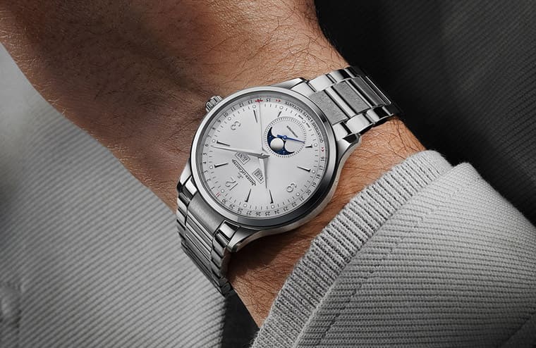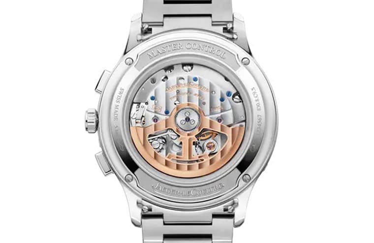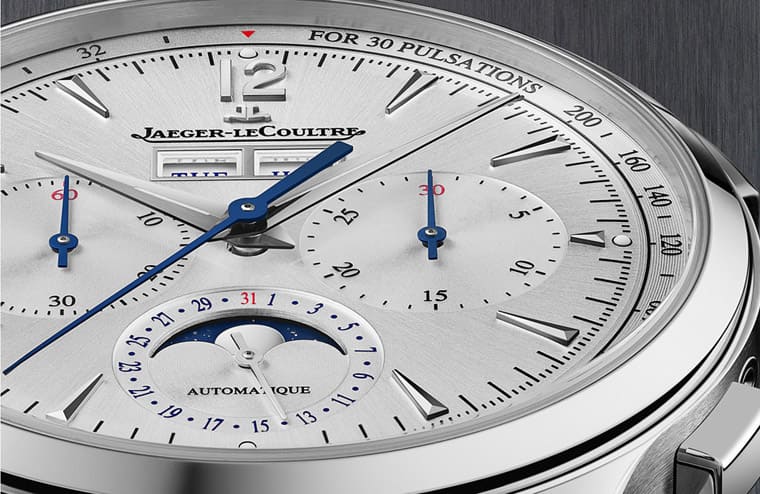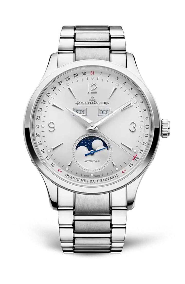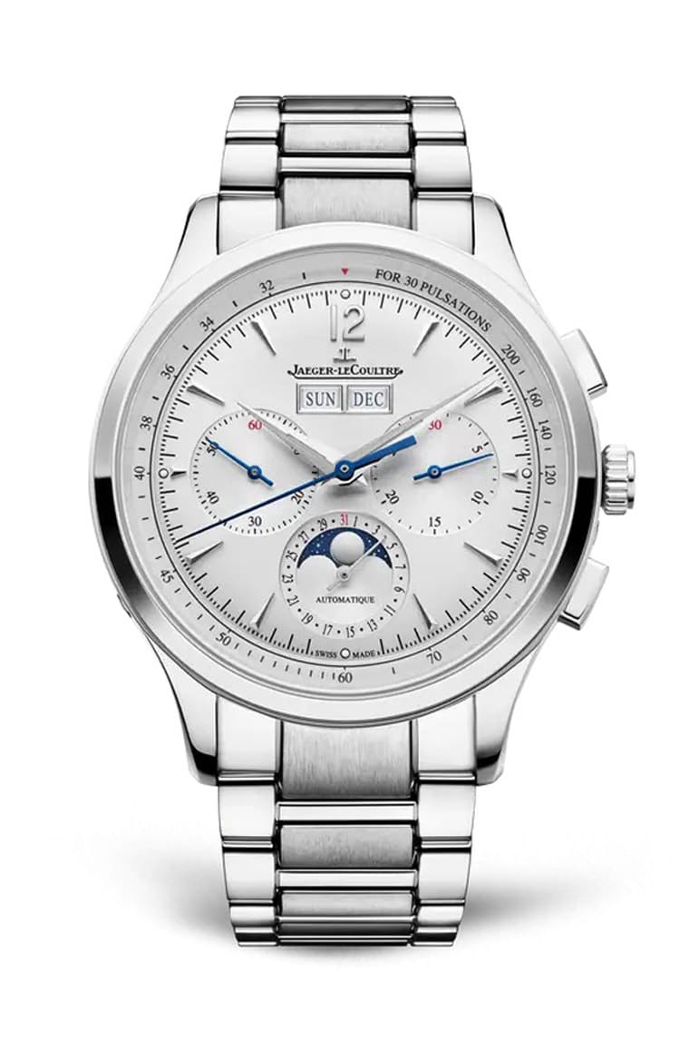 Master Control Chronograph Calendar大師系列計時日期錶同樣採用銀色面盤,手錶搭配藍鋼計時指針與藍色月相盤,使複雜功能更清晰易讀。兩款Master Control系列作品都是首次採用配備錶帶快拆系統統的精鋼鍊帶,這是現代新錶中愈來愈不可或缺的重要元素。
