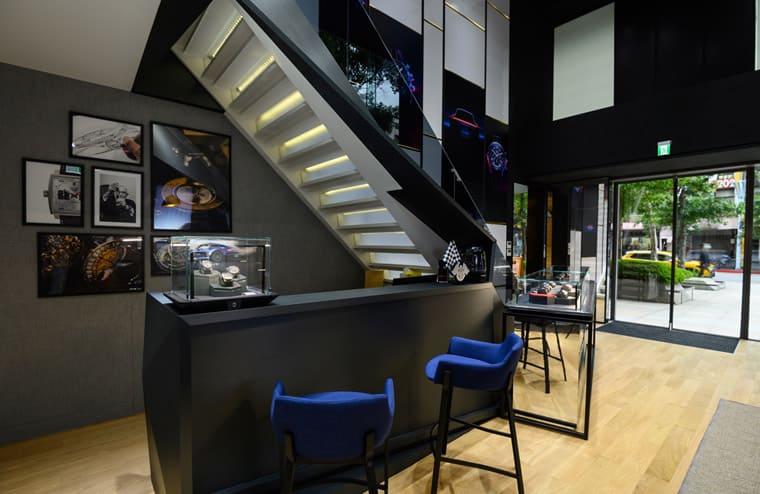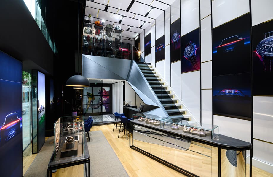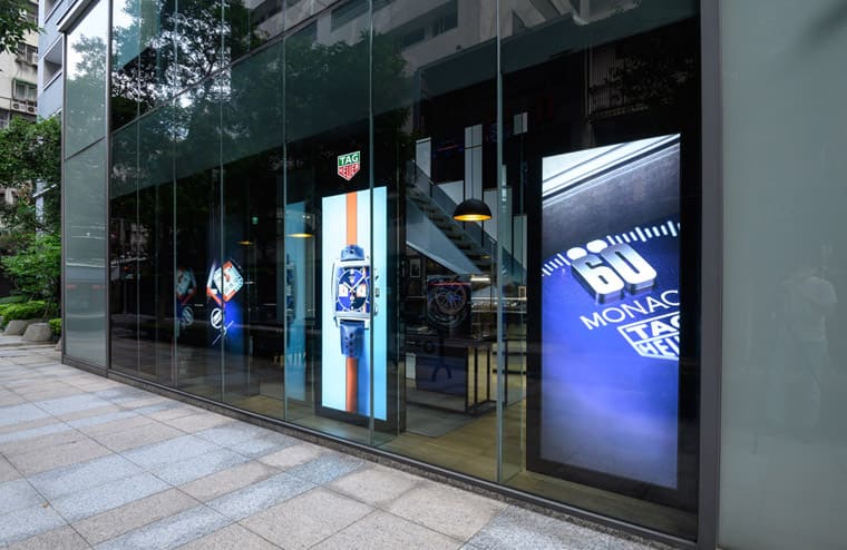 泰格豪雅專賣店採用大面積落地窗,絕佳的天然採光讓店內顯得明亮且親切。而除了公開空間之外,專賣店後方VIP室的九宮格狀佈景更一口氣展示出Monaco系列各式錶款,將品牌的賽車、生活風格等元素詮釋得淋漓盡致,提供顧客隱密且獨具品牌個性的賞錶空間。