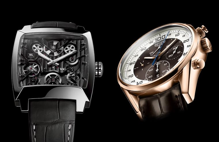 ▲Monaco V4鈦金屬手錶(左)、Carrera Mikrograph 1/100秒計時碼錶(右)。