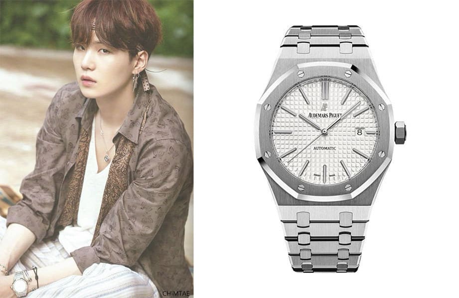 熱衷於慈善事業的SUGA對自己也是頗為慷慨,他常佩戴的手錶像是勞力士的Datejust 36還有AP的皇家橡樹自動錶,他似乎偏好銀白色系的面盤,同時也喜歡基本功能的款式,而且錶徑也是鎖定36或37mm這類中性的尺寸。