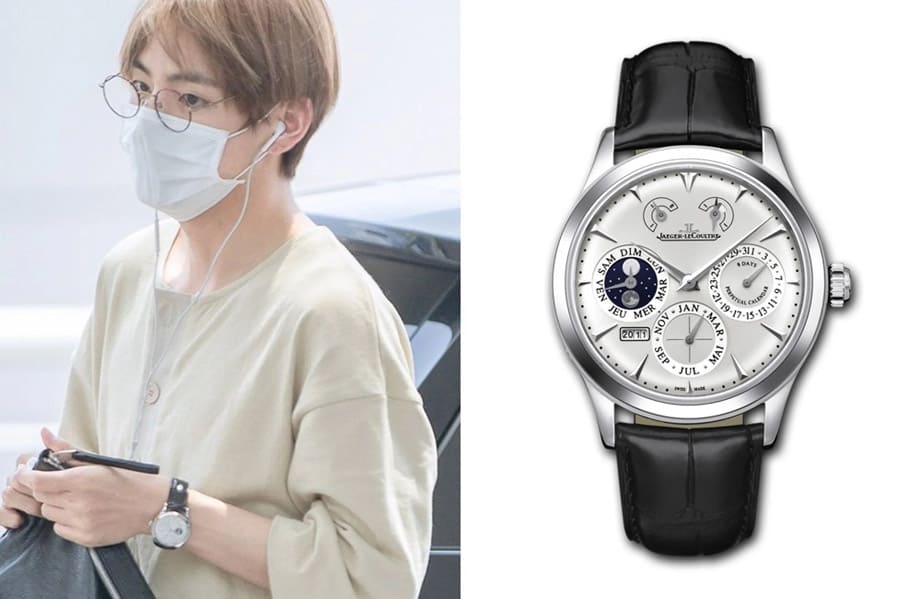 V出門時常戴著搭載石英機芯的GUCCI Le Marché des Merveilles手錶,這款錶大膽的配色完全體現出品牌的招牌風格;至於V有時也會戴積家的Master八日鍊手上鍊萬年曆或更高等級的Duomètre Quantième Lunaire雙翼系列月相日期錶,後者定價超過台幣130萬,而且這還不是V自己買的,而是某年他生日時有位中國鐵粉送給他的禮物(羨慕啊)。