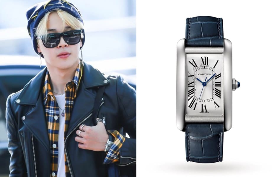在BTS中舞技出色擔任主舞的Jimin喜歡的手錶比較有個性,因為他常戴的卡地亞Tank Américaine美國坦克擁有長幾何造型,且錶殼兩側做得相對寬厚,加上錶徑也大,因此在手上看起來很顯眼。Jimin戴的是不鏽鋼錶殼搭配深藍色鱷魚皮錶帶的版本,定價NT$ 177,000(大型款)算是高級錶裡面比較好負擔的,不過Jimin看上的應該是手錶本身的歷史淵源與設計特色。
