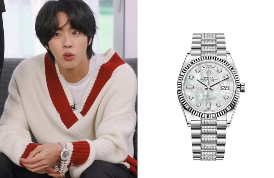 年紀與Jung Kook處在團體中光譜兩端的Jin很巧的也是最愛勞力士手錶,而且他喜歡的手錶類型還滿華麗的,像是Day-Date 36,這系列起碼都是貴金屬錶殼,Jin會看上的錶往往還要加上鑽石、珍珠母貝面盤等裝飾,戴在手上自帶光芒,就如同他是BTS的門面般,讓人第一眼看到就很驚豔。