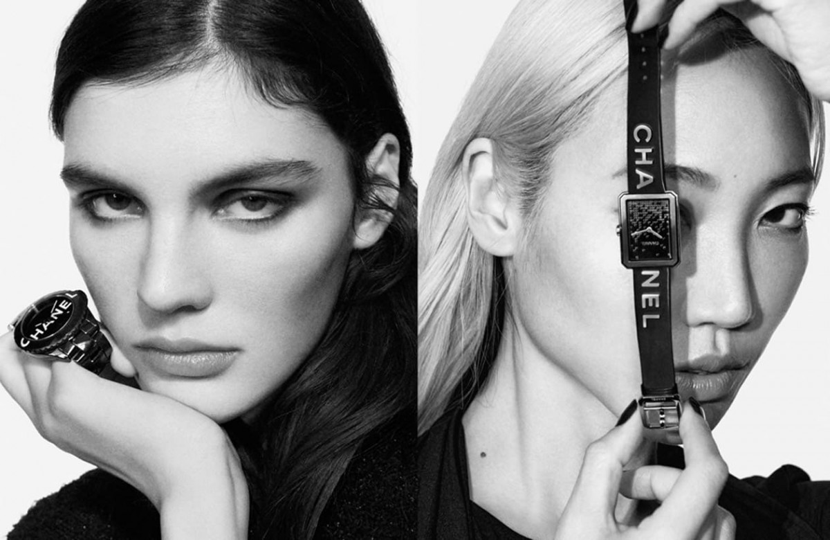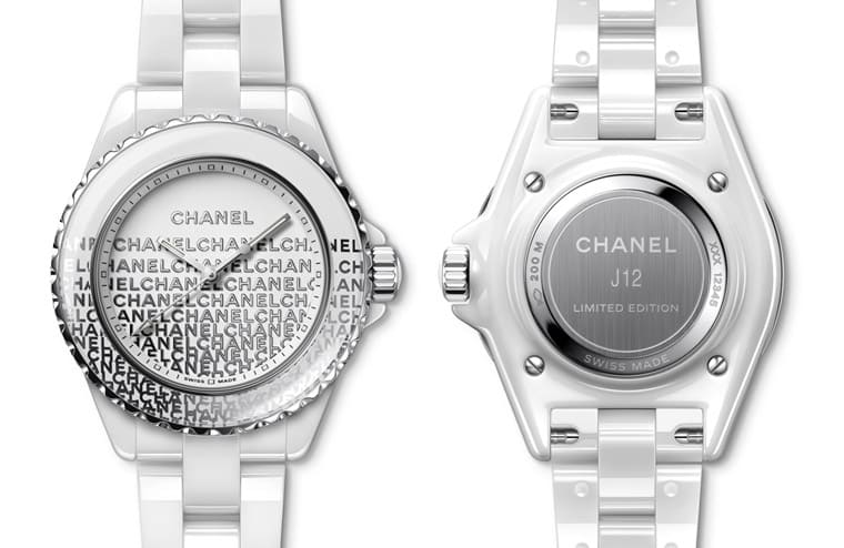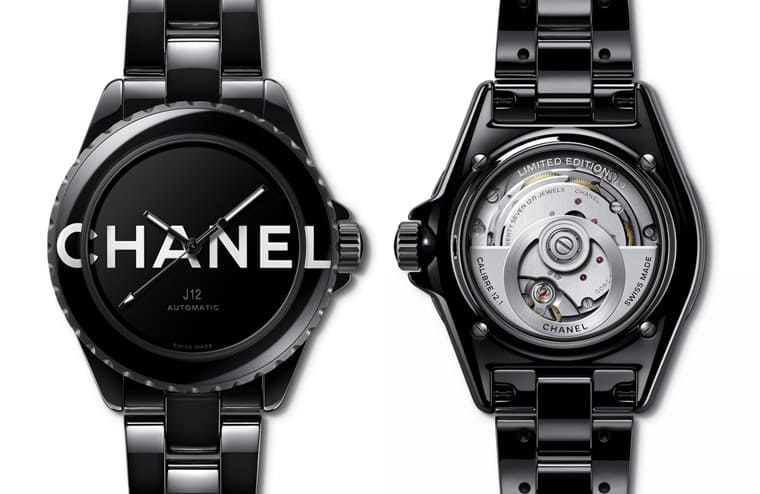 亮面黑色陶瓷為38毫米的J12腕錶注入大膽搶眼風格,手錶捨棄面盤與錶圈上幾乎所有的元素,只放上CHANEL 六個字母,塑造出黑底白字的設計橫跨面盤並延伸於錶圈上的獨特設計。至於33毫米的J12腕錶換上白色陶瓷材質,並用金銀絲細工製作的CHANEL標誌貫穿錶圈至面盤,香奈兒運用富藝術美感的不對稱結構呈現,讓腕錶正面都是香奈兒精神的主舞台。