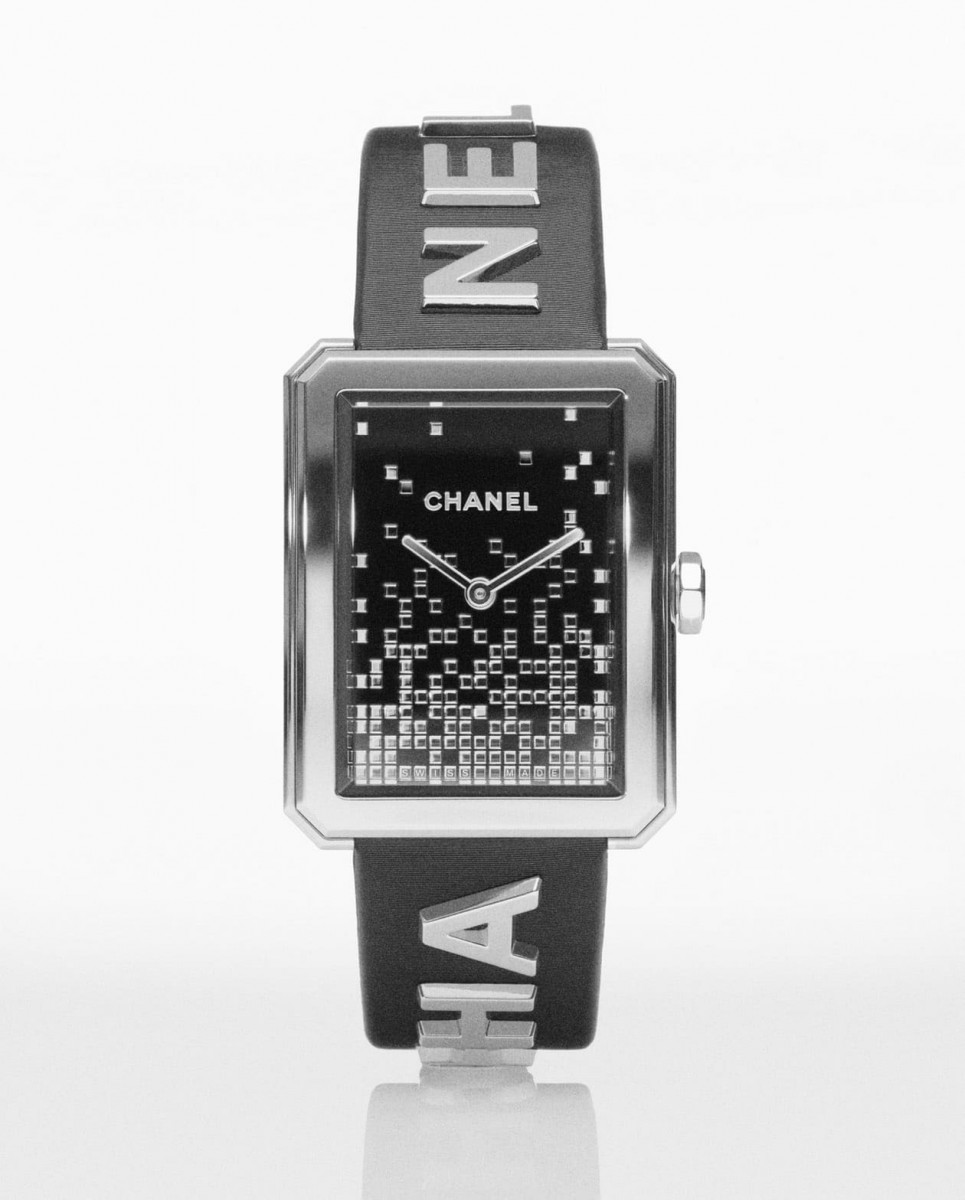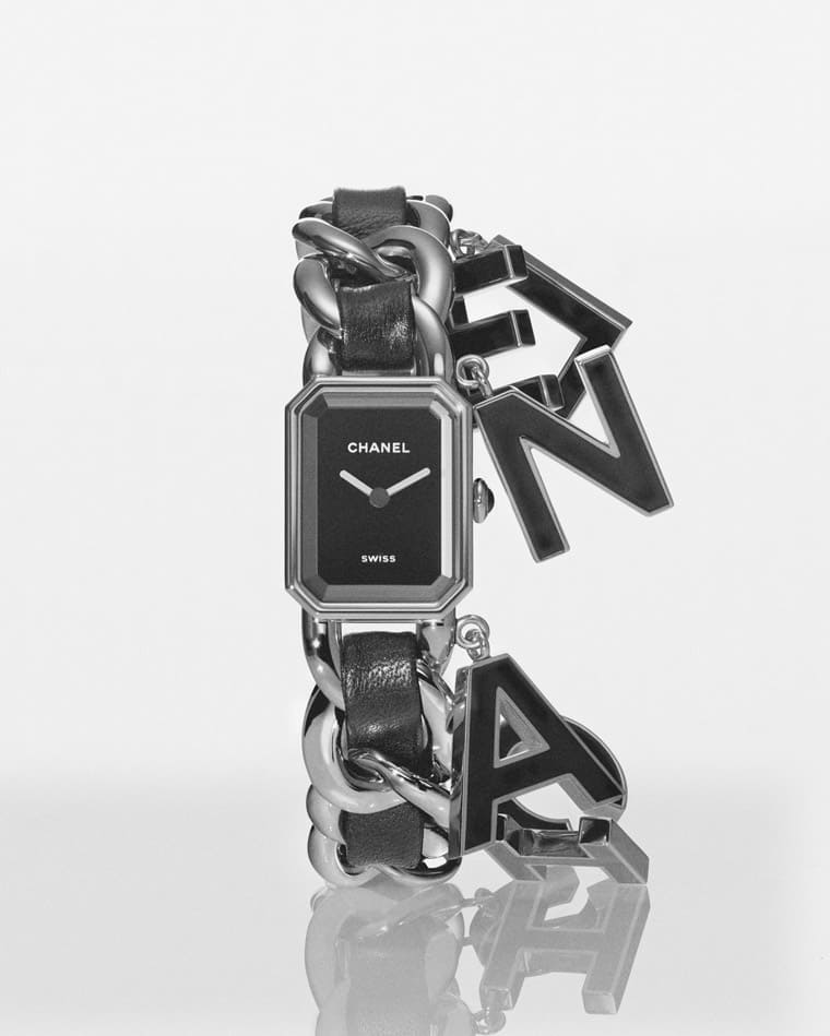 與Première Wanted de CHANEL腕錶有點異曲同工的味道,香奈兒以精鋼材質打造六個CHANEL字母並鉚接裝飾於皮革錶帶上,下方錶帶鉚接”CHA”三個字母,下方錶帶則接續放上”NEL”字樣。而手錶的黑漆面盤妝點著1990年代馬賽克風格設計的鍍銠圖騰,替二針顯時功能帶來吸睛視覺效果。