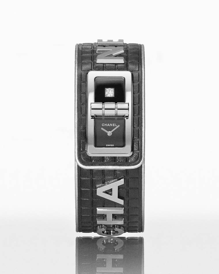 運用圖騰化的六個“CHANEL”鍍鈀金屬字母妝點黑色壓紋小牛皮錶帶。黑色漆面面盤上半鑲嵌1顆公主式切割鑽石,並與下半的小巧時、分面盤上下輝映。腕錶設計致敬搖滾年代的自信傲氣與奢華風格,其中 CHANEL字樣更是能夠引起旁人注視目光。
