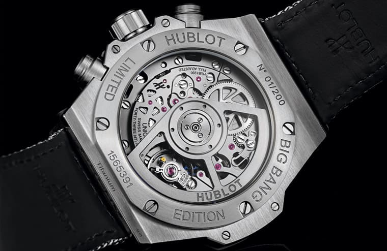 ▲錶背可見HUB1280自動機芯的精緻結構以及宇舶精修零件的細部工藝。