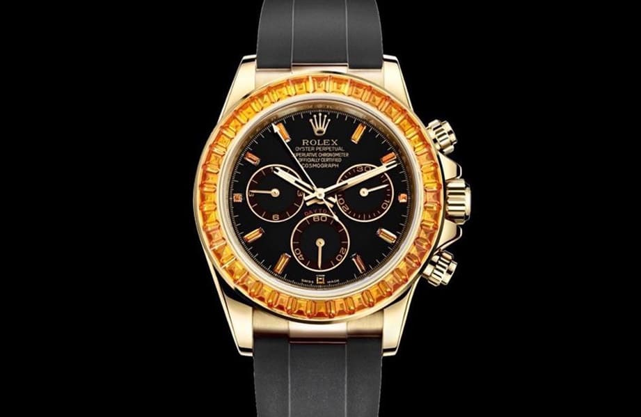 原來費天王這次戴的是勞力士2022年的目錄隱藏款Daytona 116588SACO(國外錶迷暱稱為南瓜燈),這款錶的錶殼為18K黃金,錶圈鑲上32顆矩形切割橘色藍寶石並搭配黑色面盤,原本舊款的116588SACO是採用8顆鑲鑽時標或羅馬數字時標等,今年新款則是把時標改成11顆橘色藍寶石(除了12點方向為勞力士皇冠標誌,其他時標都是橘色藍寶石)。時標改成與錶圈相同的藍寶石後,整只錶的氣場變得比較內斂但也更有一致性,而由於橘色藍寶石和黃金錶殼同樣都是暖色調,搭配黑色的橡膠錶帶和面盤互相烘托,也因此費天王穿著一襲平實的黑西裝再搭個Daytona 116588SACO就能替自己的造型加分。