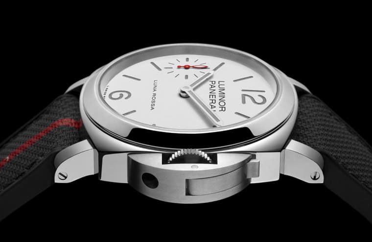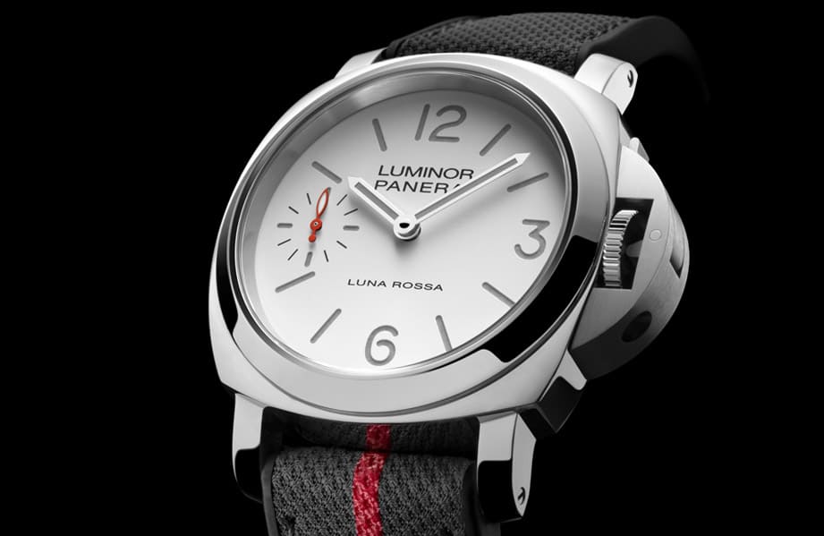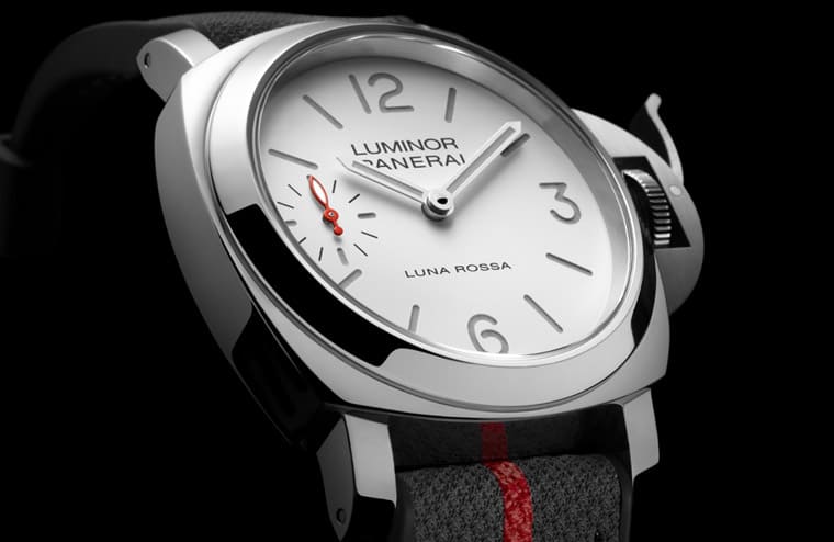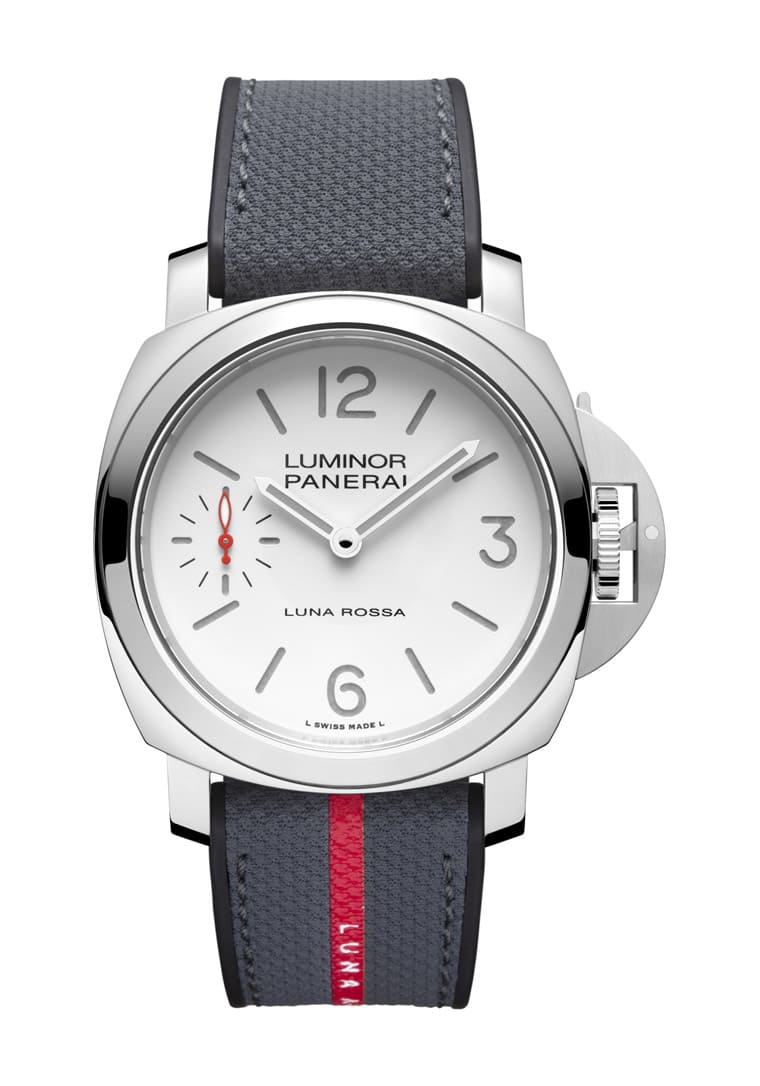 手錶面盤為白色,且屬於三明治面盤結構,沛納海分別以灰色Super-LumiNova™夜光塗層搭配9點方向的紅色小秒針呼應錶帶Luna Rossa帆船隊的招牌印象。面盤6點方向尚印有”LUNA ROSSA”字樣,將手錶的聯名主題性具體而微呈現得一清二楚。