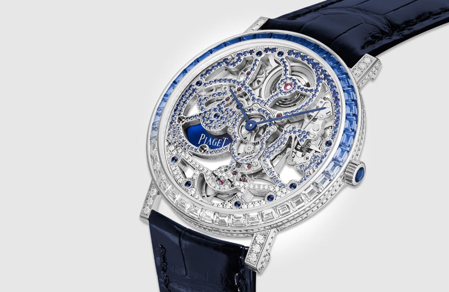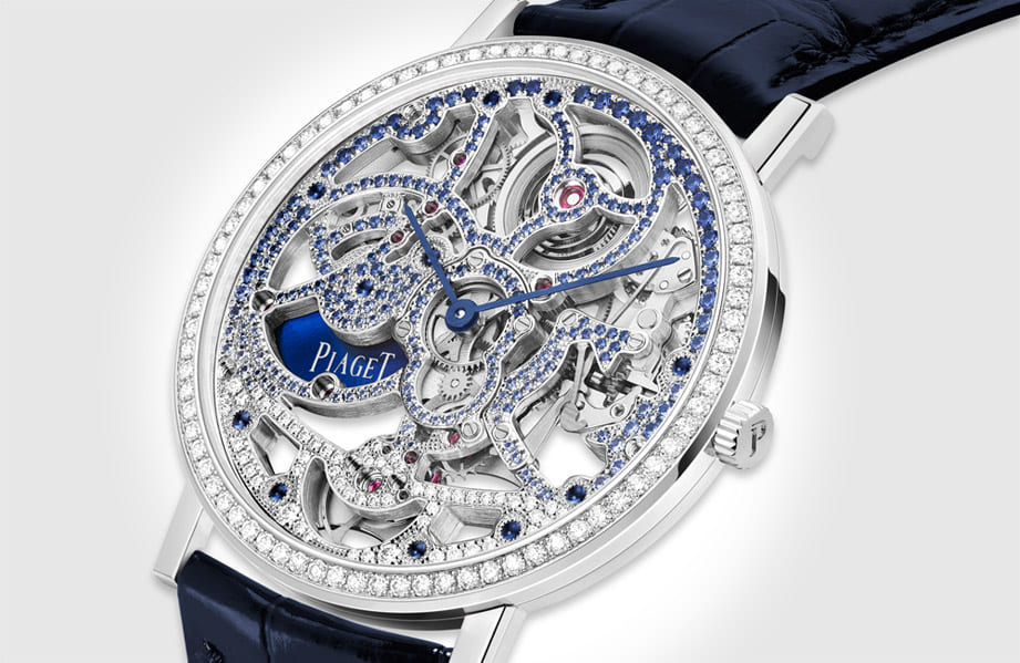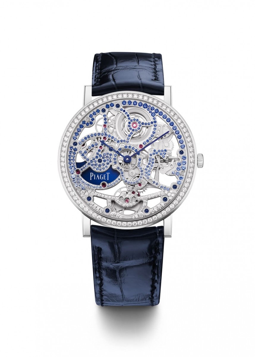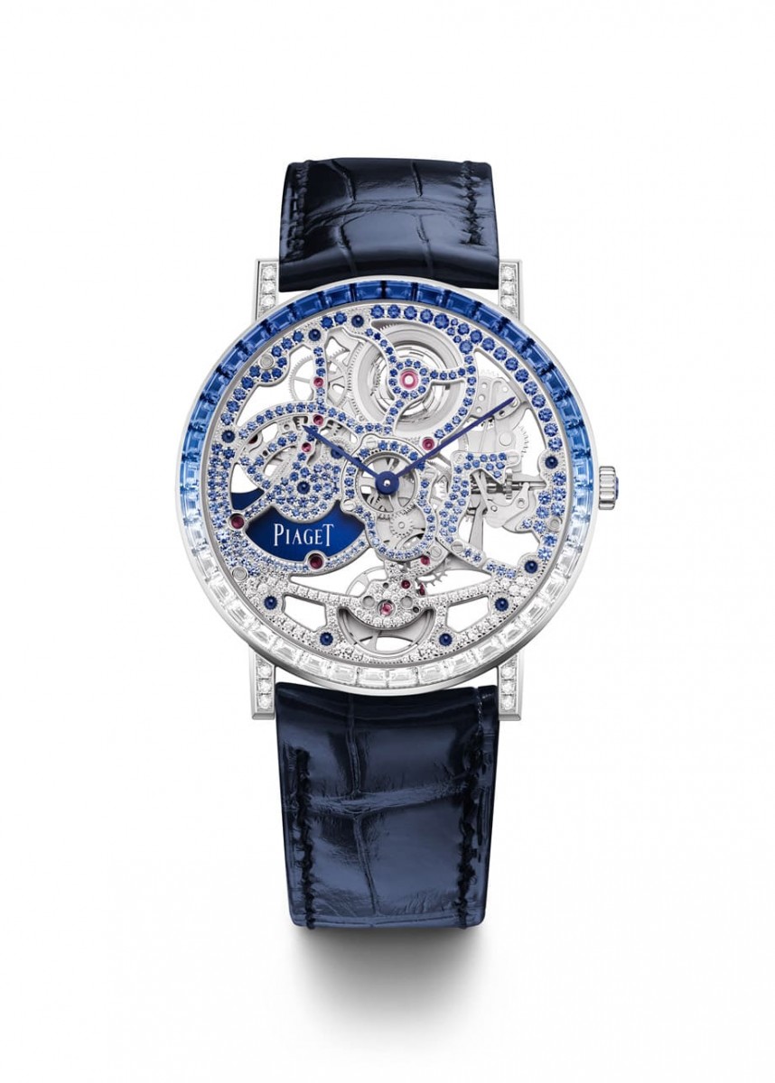 新款Altiplano Skeleton高級珠寶錶分別以白金材質打造40mm(限量18只)與38mm(限量28只)的超薄錶殼,兩者的錶殼厚度都在6mm上下,薄得令人訝異自動機械錶原來可以這麼薄!而在纖薄錶殼之外,品牌還以天空中的雲彩為主題,採用鑽石和藍色藍寶石鋪鑲於面盤外緣、機芯零件,乃至錶圈等部分,特別的是伯爵鑲嵌寶石時是按照顏色深淺排列出漸層效果,如此一來真的富有強烈的藍天白雲畫面,讓人一看到手錶便洋溢愉悅心情。