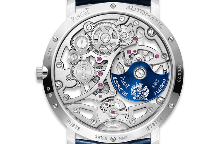 一般來說超薄手錶要把機芯鏤空已經具有不小難度,因為在零件本身已經相對薄的情況下還要將零件鏤穿,這可能會影響到機芯結構的強度與穩定性,然而伯爵研發超薄錶已有相當豐富的經驗與技術,因此品牌得以在兼顧機芯穩定結構之餘,再將鏤空工藝帶入手錶,呈現更為通透的視覺效果。不只如此,Altiplano Skeleton高級珠寶錶還在鏤空後的機芯橋板上鑲嵌寶石,鑽石和藍色藍寶石不僅鑲飾於主夾板上,也出現在機芯中那些超級纖薄的零件上,例如厚度僅0.69mm的彈簧蓋等,就連固定零件的螺絲也在伯爵的巧思下被包鑲覆蓋在11顆凸圓形切割藍寶石下,讓手錶正面顯得華麗非凡。