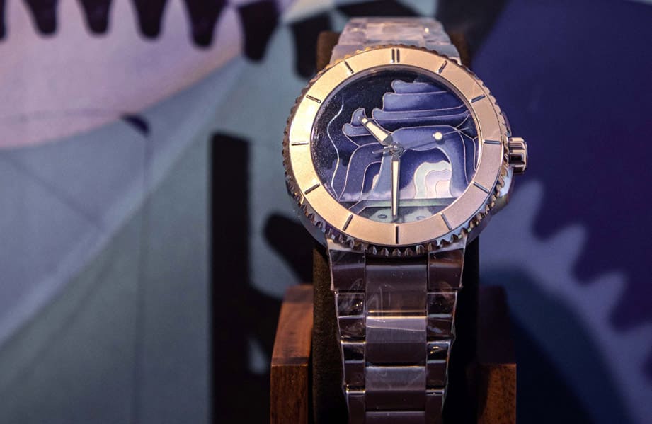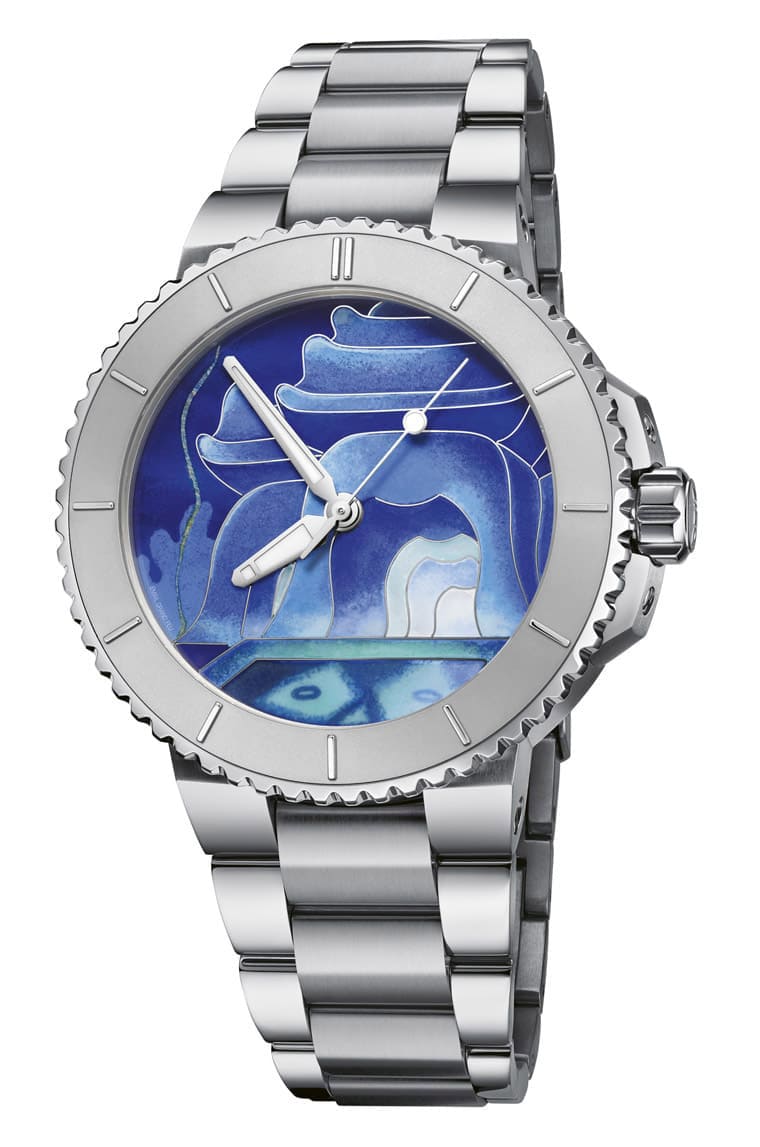 繼2021年和上海美術電影製片廠攜手推出首款Aquis日期錶孫悟空限量版後,2022年雙方繼續推出新款手錶,其仍以Aquis潛水錶系列為基礎,不鏽鋼錶殼尺寸41.5mm,這款的錶圈以磨砂+陽刻刻度的設計達到潛水錶的專業要求。品牌這次替手錶設計的面盤造型靈感源自《孫悟空:大鬧天宮》裡面龍王的水下宮殿場景,故事裡美猴王孫悟空到東海龍宮向龍王請求贊助他一把好用的兵器,最終他得到了如意金箍棒,成為伴隨他與師父唐三藏往西天取經時手上的神兵利器。ORIS在新錶上利用掐絲琺瑯工藝,將水下龍宮的畫面定格在面盤上。手錶的底蓋依舊刻有孫悟空圖案,這回品牌改刻上孫悟空的半身側身圖像,並手持看起來放大後的金箍棒(甚至金箍棒上還刻上中文,流露濃濃中國風),另外錶款也特別搭載品牌自製的Calibre 400機芯,這枚話題機芯具有5日動力儲存、高抗磁性,還可以享有10年保固服務。