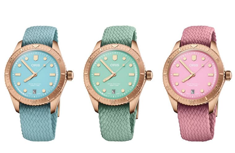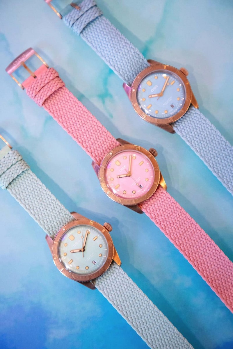 新款Divers Sixty-Five “Cotton Candy”維持手錶原本的設定包括38mm青銅錶殼、復古設計、幾何造型時標與100米防水性能等,但是品牌此次視不同面盤顏色替手錶搭配藍色紡織錶帶、綠色織帶或粉紅色織帶(一律搭配青銅錶扣),讓手錶呈現一致色調之餘,也散發出溫暖、輕盈和溫柔的氣息,讓人第一眼就充滿好感。2021年時Divers Sixty-Five棉花糖系列分別有青銅鍊帶與棕色皮帶兩種版本,定價當然是鍊帶會高於皮帶,而2022年新增的再生Perlon錶帶版本定價剛好介於去年兩個版本之間,總的來說無論搭配哪種錶帶,這款的入手門檻依舊是錶壇各款青銅錶中相對好入手的一類,而且它還擁有搶眼的面盤配色這個亮點,讓人在選擇入門青銅錶時多了個愛上它的理由。