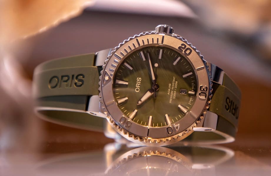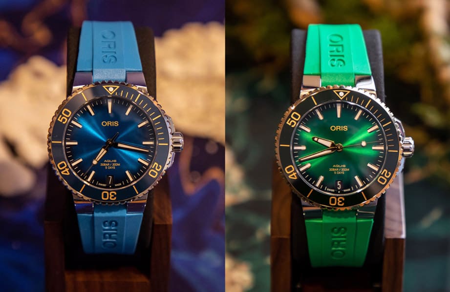 ORIS為了支持非營利組織Billion Oyster Project(BOP)的計劃——在紐約港復育十億顆牡蠣,而開創出新作Aquis紐約港限量錶,錶款限量2,000只,特色在於面盤採用炫目的綠色珍珠母貝,這個靈感來自著名的紐約港水面顏色以及牡蠣殼本身顏色,錶如其名呼應其創作目的。ORIS這次使用珍珠母貝材質製作面盤,過往這種材質被視為適合女錶的裝飾素材,但是品牌採用的是相對罕見的綠色珍珠母貝,有別於白色珍珠母貝的婉約甜美,綠色珍珠母貝串連起人們對紐約港海水的印象以及貝殼原色,無論男、女性都很適合。