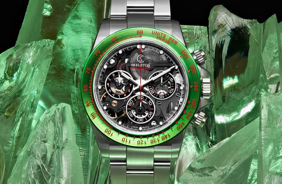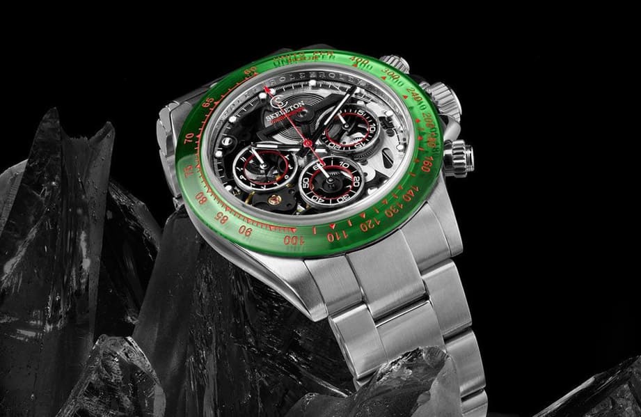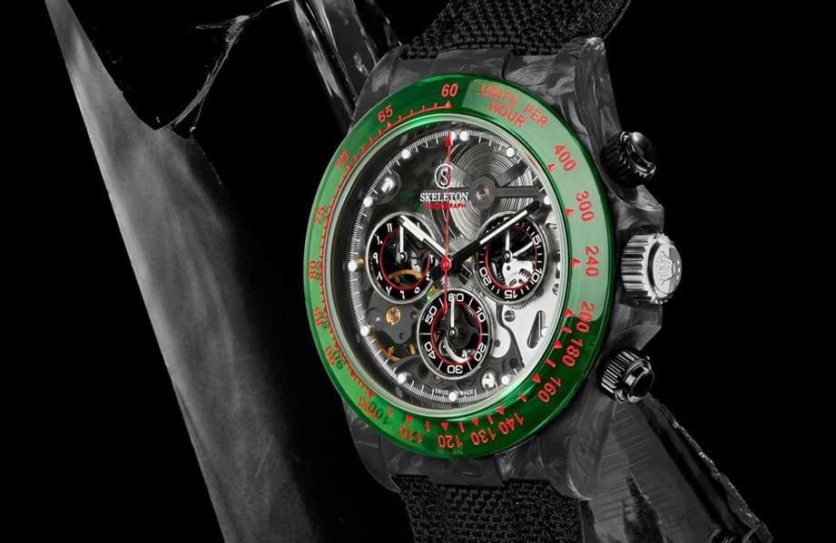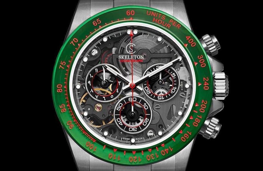 ▲錶殼與鍊帶經過無菸煤PVD處理,錶圈更是換上常用於製作防彈玻璃的聚碳酸酯材質,其綠色搭配紅色測速計刻度帶有呼應摩洛哥國旗的用意。Source:SKELETON CONCEPT