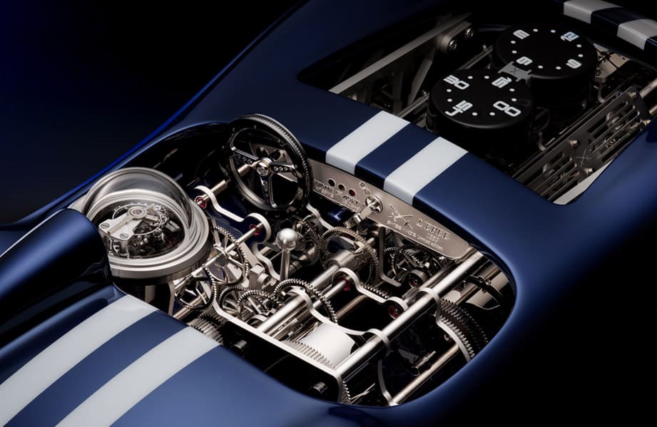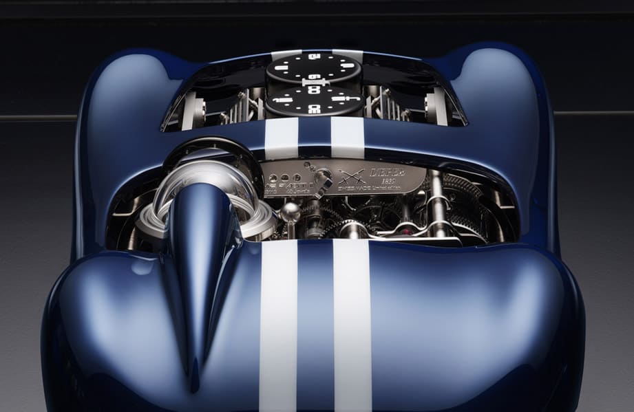 第二枚機芯為引擎的自動裝置提供動力,用家只要轉動儀表盤的鑰匙就可啟動引擎,這時V8活塞會上下移動,不過這裡的設計主要是為了揣摩真實賽車的運作感,與顯示時間本身倒是無關。
