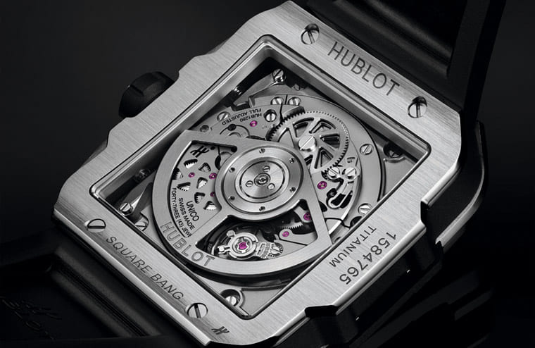 Square Bang Unico系列搭載自動機芯由354枚零件組成,在面盤側可見6點鐘位置的導柱輪機制,其有助於準確無誤地執行計時動作,另外包括兩枚小錶盤、日期顯示環等在面盤上都能一覽無遺,至於錶背則能見到圓形的機芯本尊,機芯四周空間的夾板牢牢固定,品牌進一步將自動盤鏤空,使佩戴者可以更清楚看見輪系傳動以及擒縱系統擺盪的動態等,發揮機械錶引人入勝的微型工藝魅力。