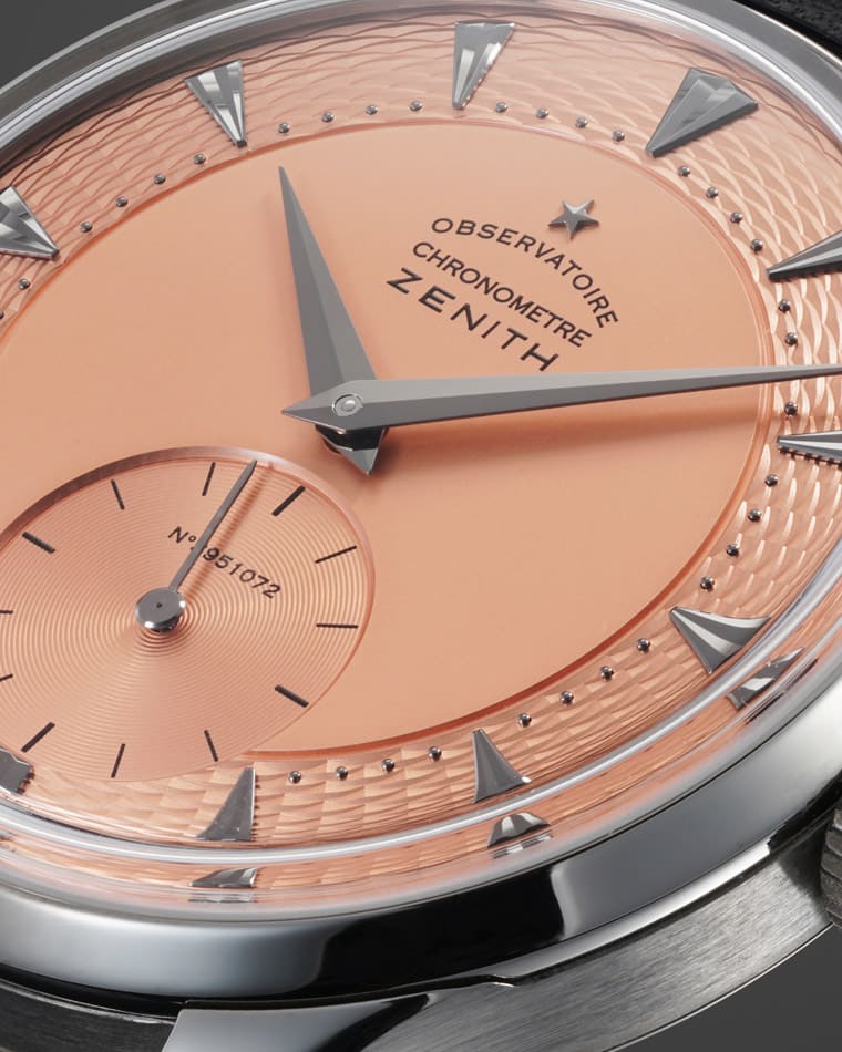 錶款採用復古類型手錶三不五時會出現的鮭魚面盤,Kari Voutilainen的Comblémine工作室進一步在面盤外圍加上機刻魚鱗狀麥穗飾紋(Guilloché),搭配太妃式指針、三角錐形時標和鑲貼拋光圓點時標,典雅精緻之餘又帶點高級工藝獨有的奢華感。面盤6點方向小秒盤印有一串神祕數字,原來那是機芯專屬序號,用意是要向Calibre 135-O機芯過往的光榮歷史致敬,出於相同目的的設計還可從面盤下緣的”Neuchâtel”字樣中略窺一二。