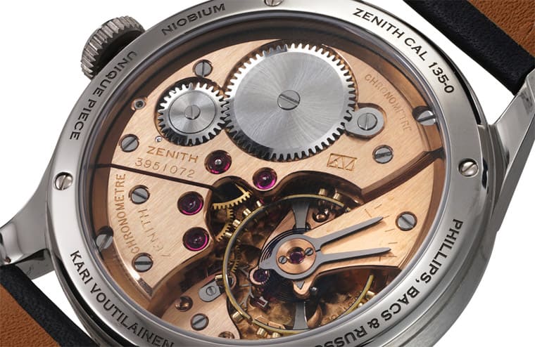 Calibre 135-O Unique Piece搭載的機芯為這批古董機芯中首見採用玫瑰金色零件的特殊案例,Kari Voutilainen與其團隊接手真力時修復好的機芯,再進一步加以修飾,由此更增添了手錶難能可貴的意義。除了機芯真面目,錶背還有一些重點例如同時鐫刻ZENITH、KARI VOUTILAINEN和富藝斯的名稱,另也點出手錶的Unique Piece身份與鈮金屬錶殼,讓人眼見為憑手錶的不凡意義。