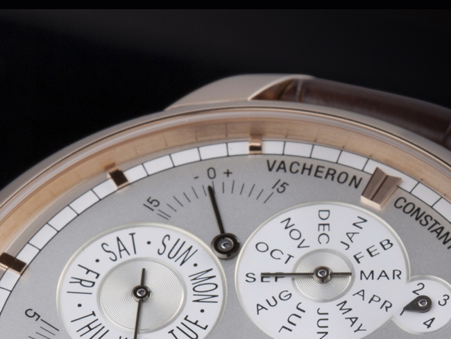日升日落時間顯示位於面盤8點與4點鐘方位刻度分別是5~7與17~18的扇形視窗,必須針對手錶使用地點製作,這項奧妙難言的複雜功能同樣使用一枚凸輪,根據使用這款錶的地點緯度製作凸輪輪廓,它展示了江詩丹頓工程師們的設計才能,以及對每位客戶的尊崇態度,可以自由選擇應用日出日落時間的精確地點,讓它成為一項必須客制化的複雜功能。