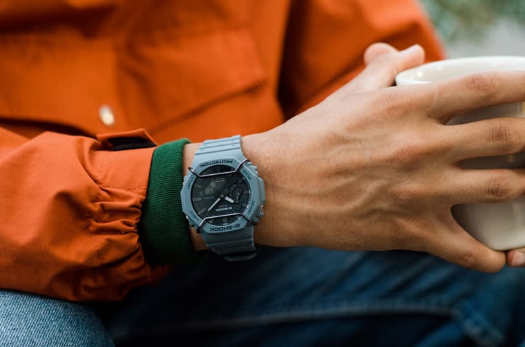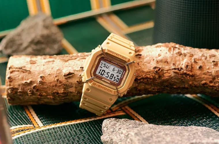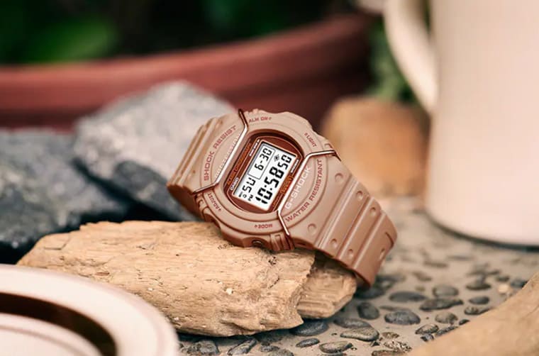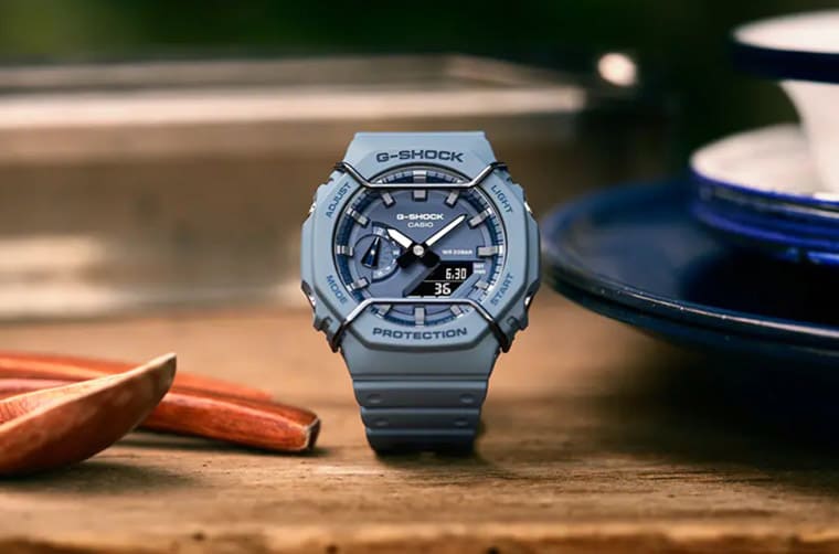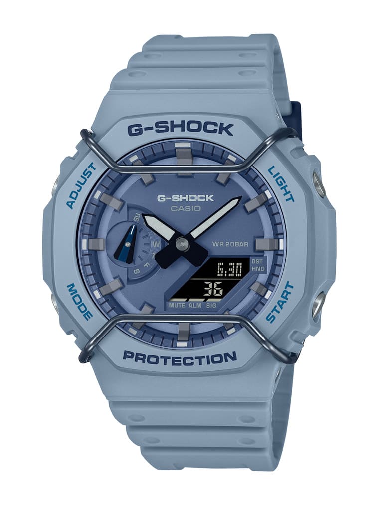 此次的Tone-On-Tone Protector系列外觀皆採用霧面單色調的樹脂材質製成,如DW-5600PT-5為鵝黃色、DW-5700PT-5為紅棕色,農家橡樹一口氣有兩款,分別是深灰色的GA-2100PTS-8A和水藍色的GA-2100PT-2A等,這種大地色系很適合和Outdoor服裝搭配,不管戴去爬山、露營等都很稱職。品牌為了營造出和諧的視覺效果,因此上下錶圈的金屬保護器都會鍍上與錶殼呼應的色調,如DW-5600PT-5的金屬保護器便是金色。