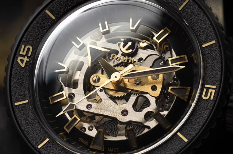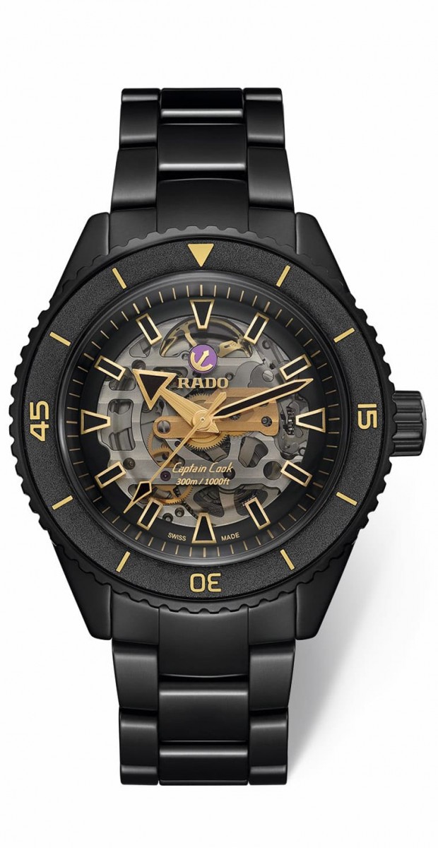 為了慶祝全台最大旗艦店開幕,品牌也特別規劃新上市的Captain Cook庫克船長300米高科技陶瓷鏤空限量錶在該店獨家販售。錶款採用霧面黑色高科技陶瓷材質製作錶殼與鍊帶,開面設計的面盤讓人得以從正面一窺R808自動三針機芯的奧妙,在煙燻色藍寶石鏡面的透視下可見日內瓦波紋裝飾和黃色電鍍處理的輪系橋板等,且包括錶圈刻度、指針與時標等都以金色突顯,在錶殼與鍊帶的黑色調烘托下格外耀眼高貴。