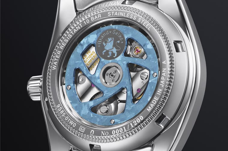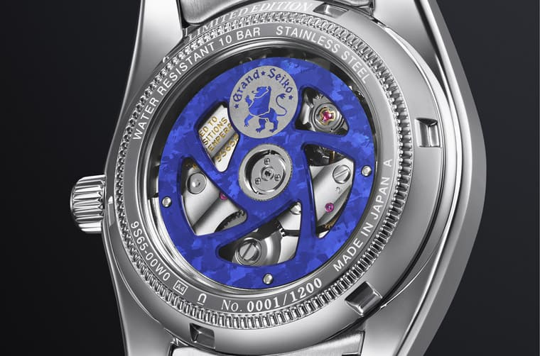 ▲錶款透視背蓋可看見GRAND SEIKO Blue色調的自動盤設計。