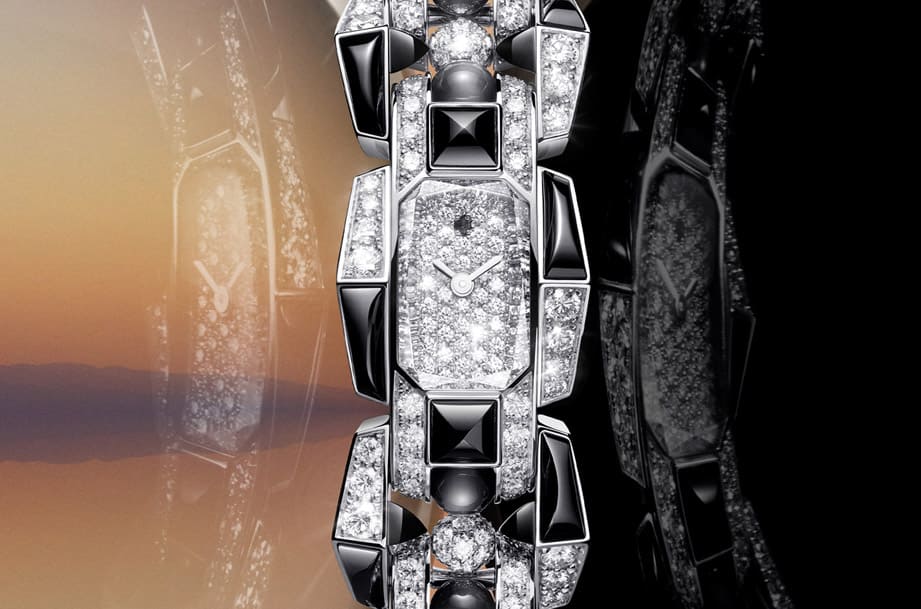18K白金材質/石英機芯/時、分顯示/錶殼鑲鑽28顆、尖晶石、黑曜石/鍊帶鑲鑽603顆、尖晶石、黑曜石/面盤鑲鑽71顆、尖晶石/藍寶石水晶鏡面/防水30米/錶徑32.7x18.4mm